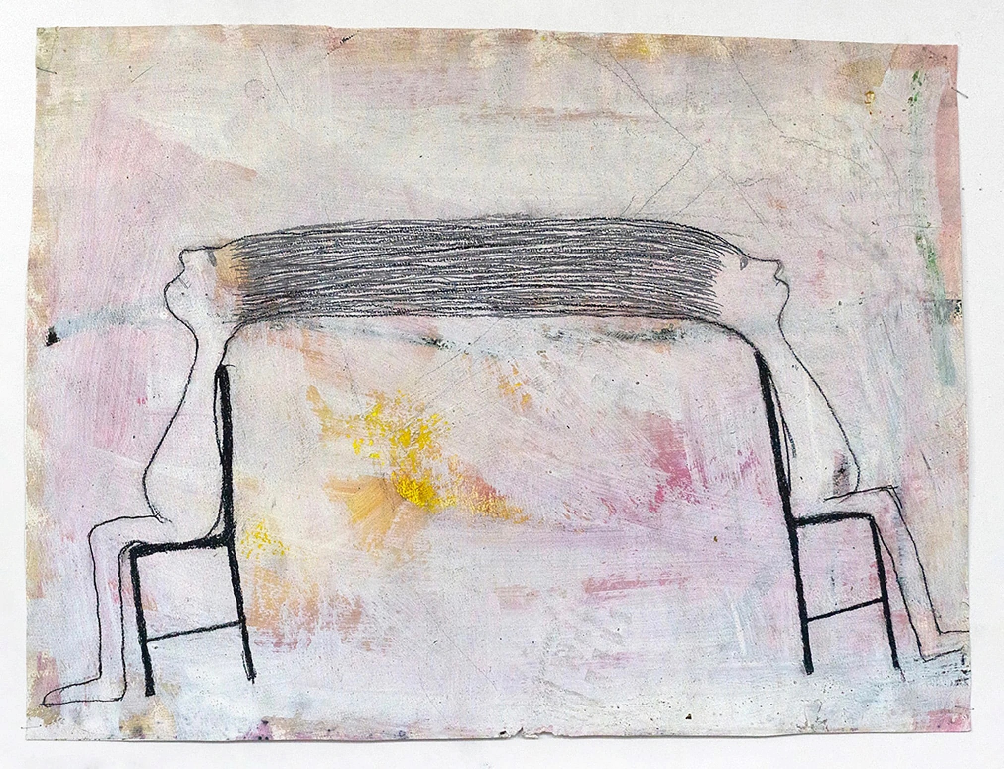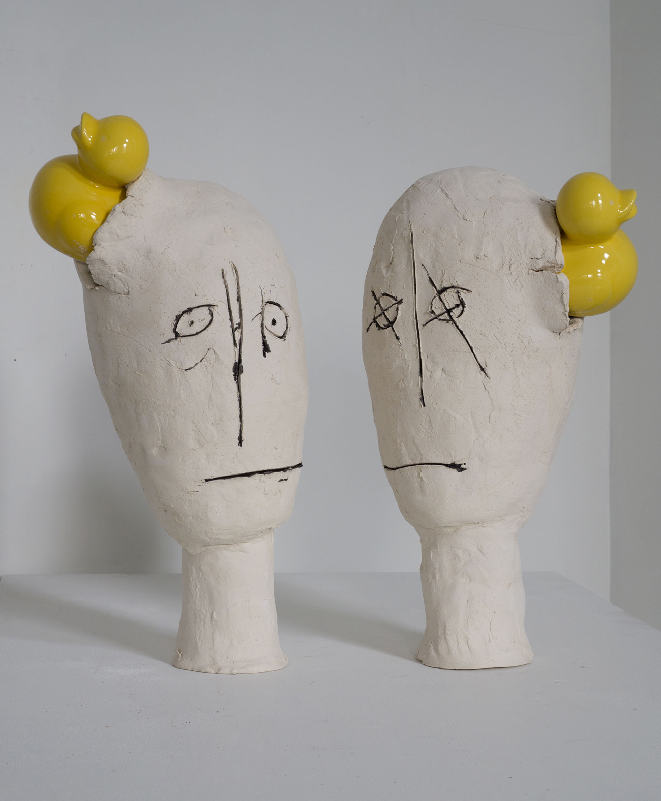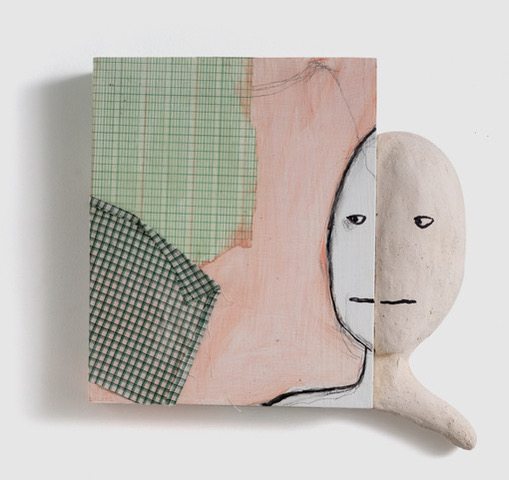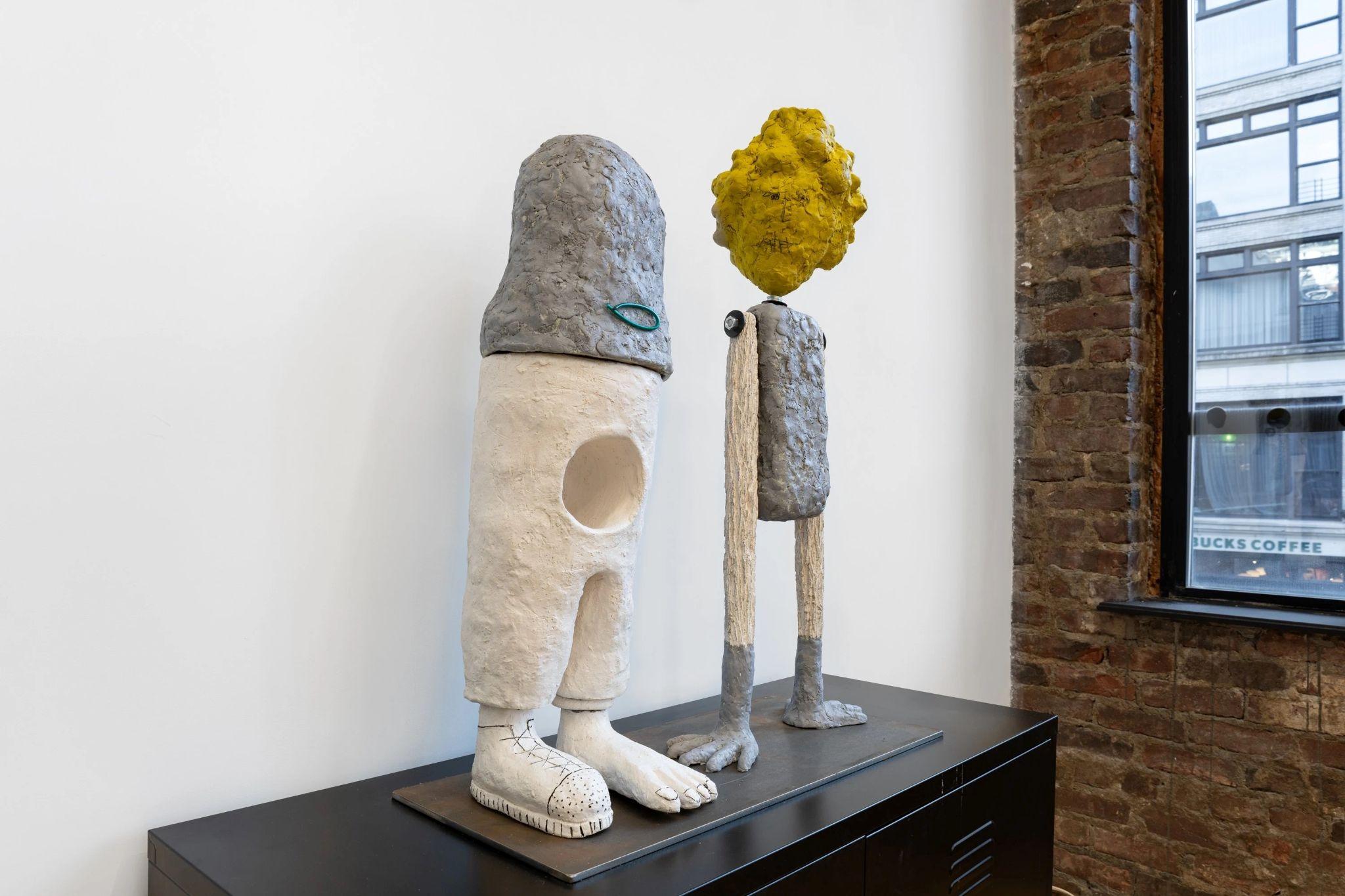 In her solo exhibition Chat & Chew at DFN Projects, multi-disciplinary artist Melissa Stern features drawings, assemblages, and sculptures which probe into the surface of social decorum not only with a biting wit but also with a tender gaze. Her outlandish characters invoke in the viewer an unsettling tension between elusive simplicity of forms and deep psychological complexities. Couples stare or reach out to one another, mouthless faces seem to whisper—whether rendered with graphite, pastel, and colored pencils, or molded with clay, these figures form an array of characters we may interpret as archetypes in dreams or comic strips. They remind me of duos in a Becket play or characters in Saul Steinberg’s absurd universe—with Stern’s very own take. Stern’s protagonists express distinct attitudes and appear to have lots to say. Underneath the verbiage, you can sense a vulnerable core that is silent, on the verge of coming up to the surface.