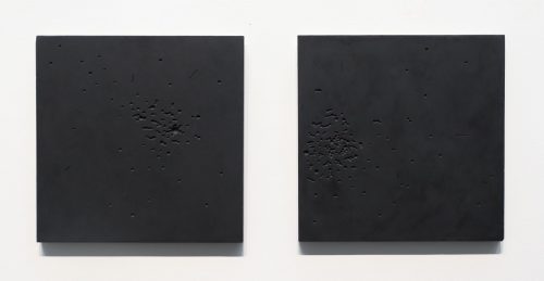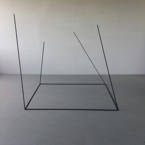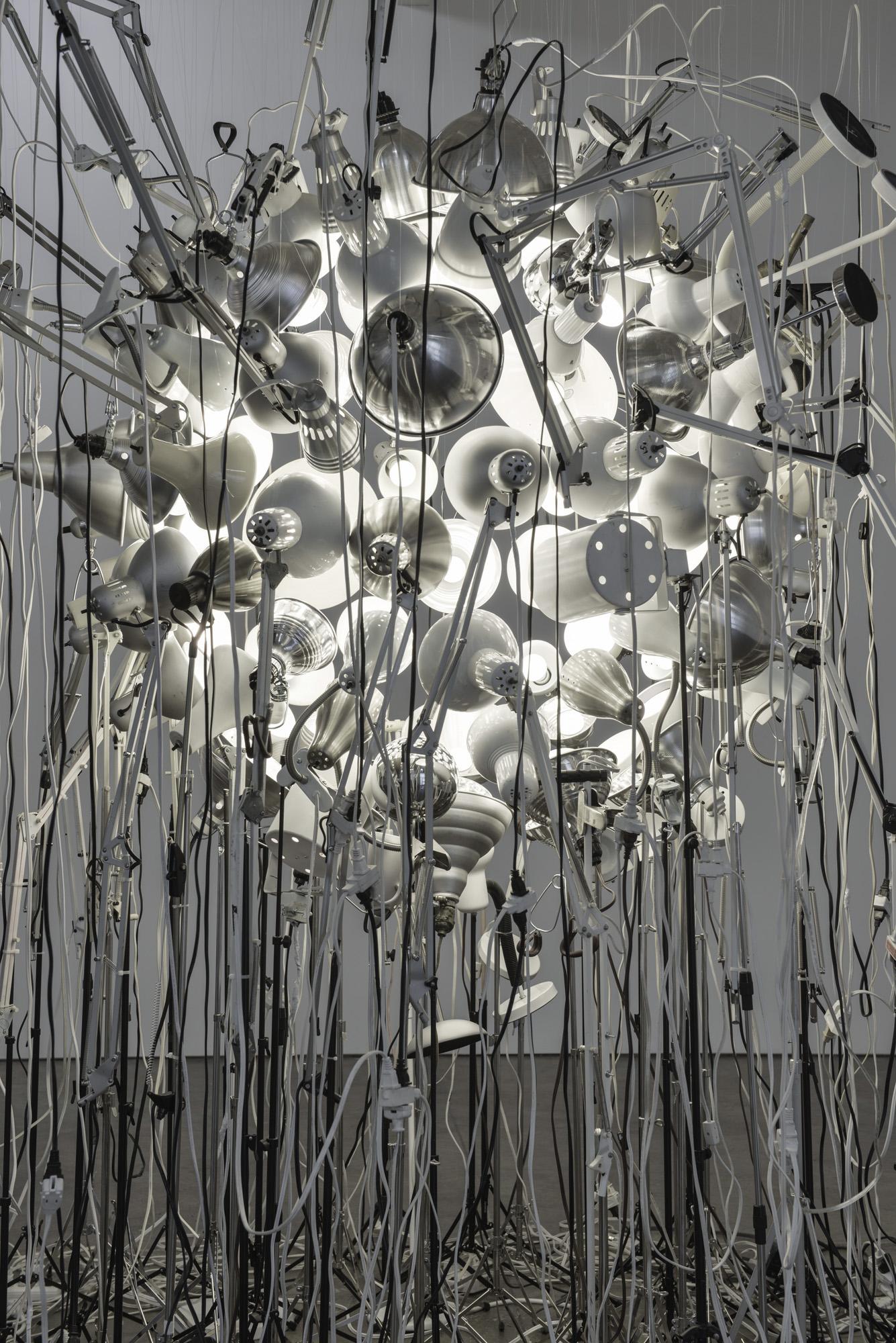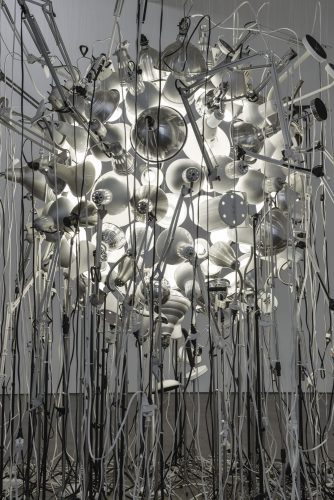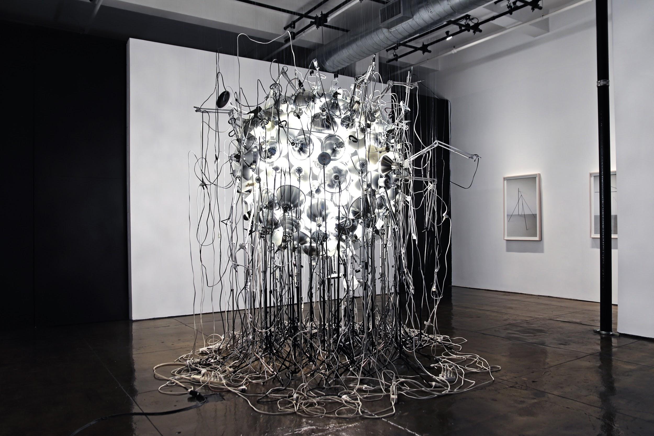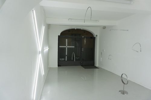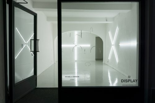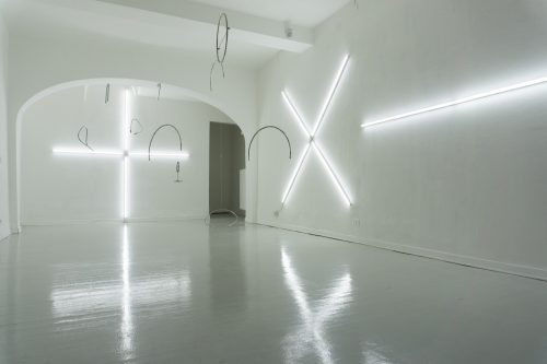 Michael A. Robinson’s site-specific project Somma, at DISPLAY in Parma, Italy, is the sum of many parts, all operating in tandem. The installation appears simple, featuring three wall-mounted LED works and metal arcs and hoops suspended from the ceiling. The space’s glossy floor and glass façade and door reflect the light emitted by the LEDs, potentially multiplying their presence based on the viewer’s position and the level of ambient light.