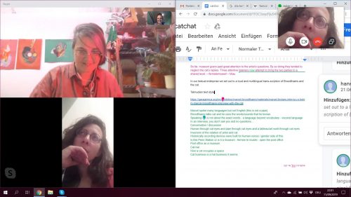 “This is an interview recorded at the Museum of Modern Art, Department of Eagles, 12 Burgplatz Düsseldorf,” announces the interviewer. “MIAOW! MIAOW!” replies the interviewee.” In 1970, the Belgian artist Marcel Broodthaers (1924-1976) conducted and recorded an Interview With a Cat. In Catchat, a trans-Atlantic collaboration between Hannah Bruckmüller, Michal Ron, and Noa Ginzburg which was recently published on PROTOCOLS, the three listen carefully to the protagonist cat and transcribe French and Cat tongues into Hebrew and Latin letters. Kristen Clevenson and Noa Ginzburg share with Art Spiel their conversation about cats, collaborating while in different time zones, transcribing illegible languages, and using deep listening to assert agency.