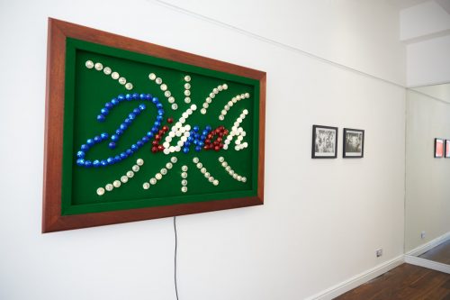 Dibnah in Lights is hard to miss. The name of that legendary Yorkshire steeplejack flashing in red, white, and blue bulbs against the green felt backdrop of a repurposed snooker table is the first piece that greets you as you walk through Grove Collective’s doors. This piece by Mitch Vowles, a sculptor who works with found objects to draw out their cultural and personal contexts, nestles easily amongst Connor Murgatroyd’s pastel-hued still life paintings of anthuriums, signet rings, Sinatra albums and a scaffolders A-Z, and film photographer Alfie White’s hand-printed images of boys at Brixton bus stops, on Tottenham blocks, and playing in Burgess Park.