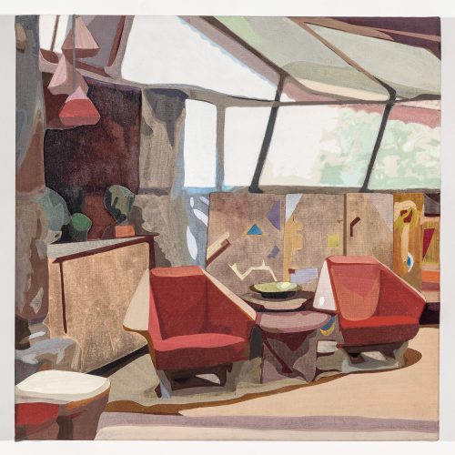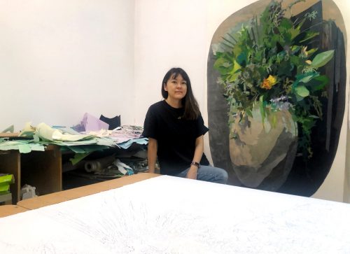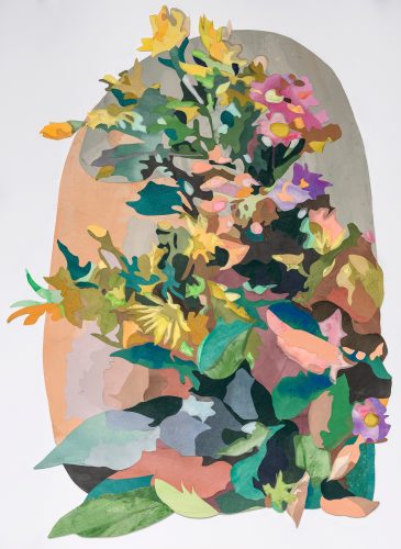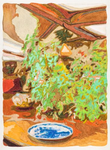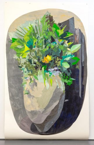 In her drawings, murals and paintings, Japanese born, and Brooklyn based artist Naomi Kawanishi Reis, utilizes paper and fabric to make idealized spaces, ranging from utopian architecture of modernism, gardens, and more recently, still life in domestic spaces. In this recent body of work, Reis starts with photographs taken by her mother of her ikebana arrangements displayed outside the family home in Kyoto. Reis downloads the images from the family online chat, the link that has connected her diasporic family across oceans.
