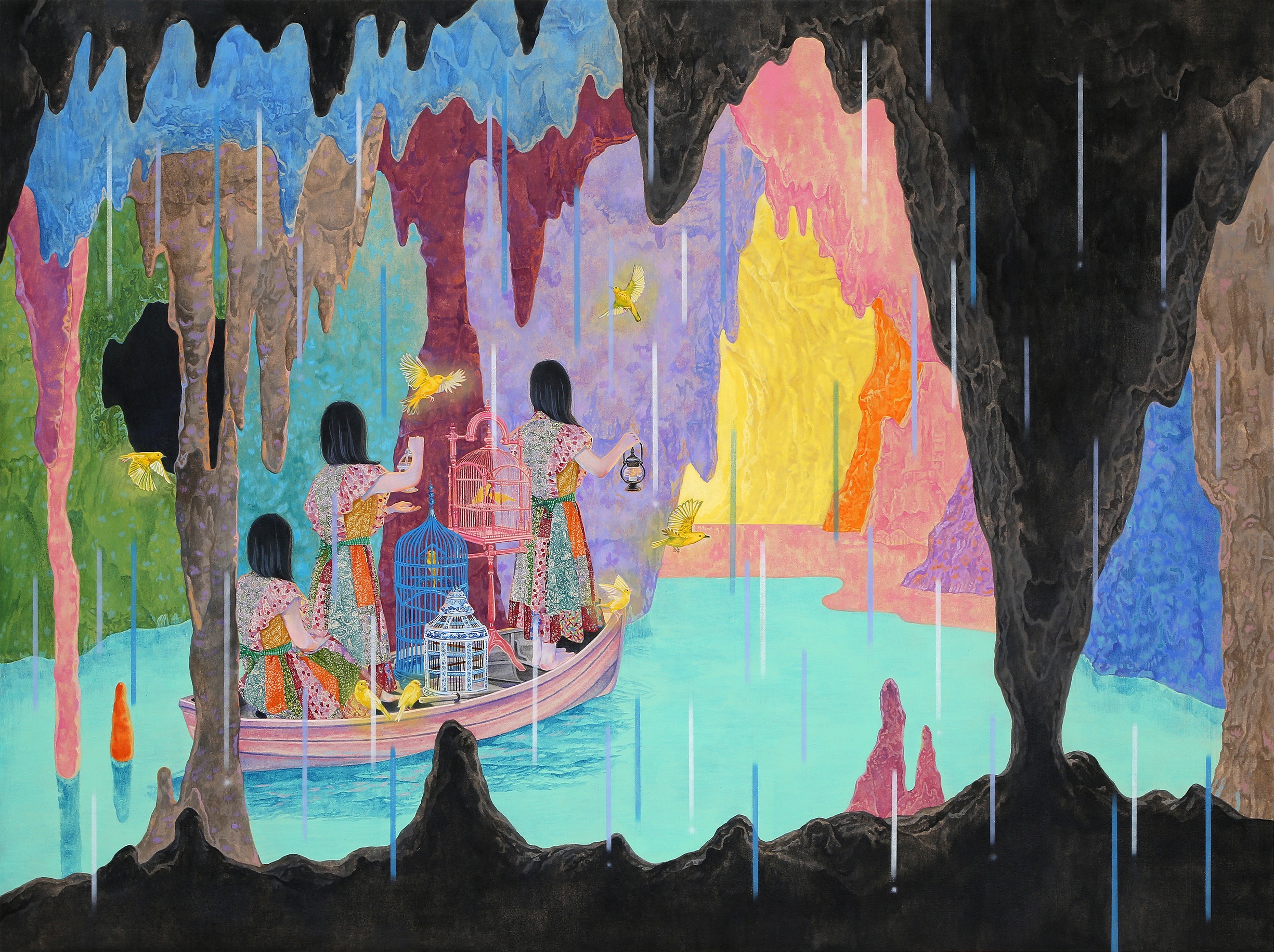 When Naomi Okubo decides to begin working on one of her enthralling paintings, there is a multistep process that far proceeds the brush gracing the canvas. The careful preparation of materials, digital and physical, allow Okubo to consolidate her thoughts and produce an organic depiction of her personal experience. The authenticity with which this is depicted is a result of the forethought and boundless introspection that she imposes upon herself. It is important to note that the artworks selected for the exhibition Naomi Okubo: Resonance on a Surface currently on view at Fou Gallery, weave a narrative fabric that chronologizes Okubo’s development as a visual artist.