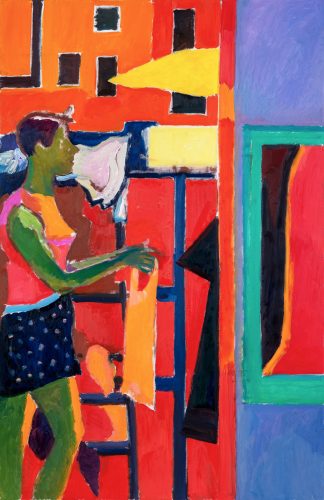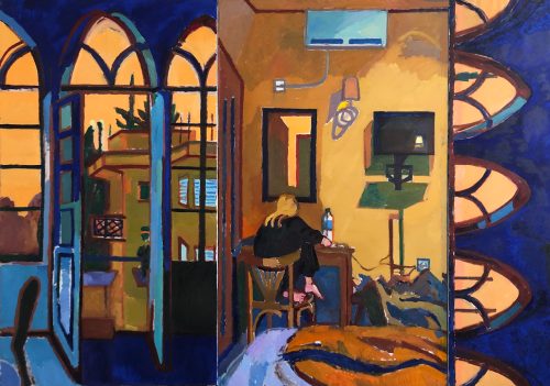 I am meeting Natalia at Kaliner gallery on a steamy day in June. The artist, who arrived here for this milestone exhibition, her first solo in New York, is uncertain when and how she will be able to return home to Israel. The war in Iran was launched just a week after the opening. Stranded away from her family, she remains determined and optimistic. This toughness in the face of chaos is also evident in her artwork. The paintings in Nightlight are vibrant, large, and striking.