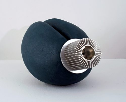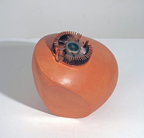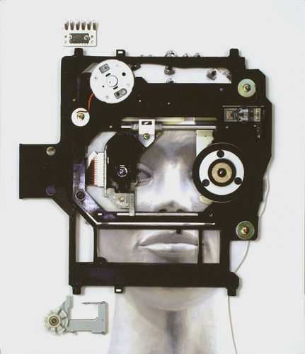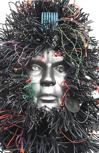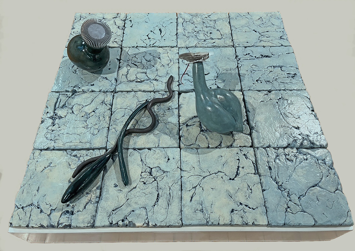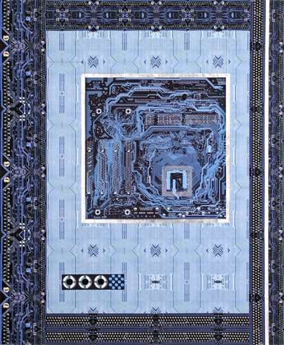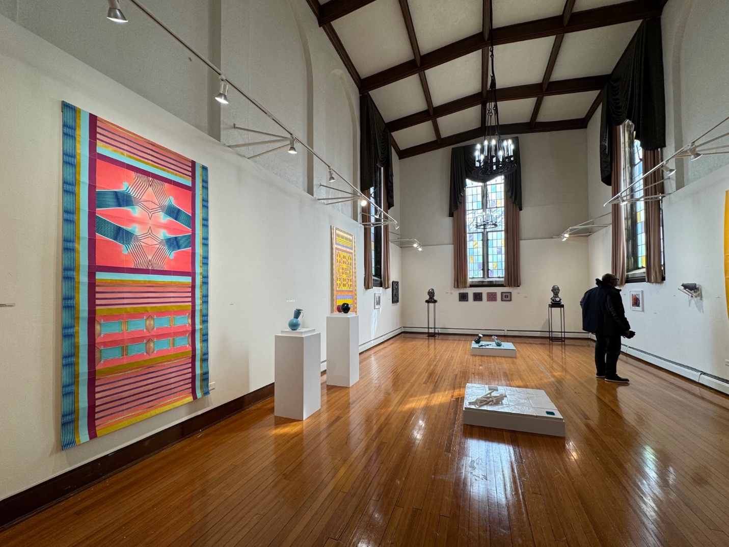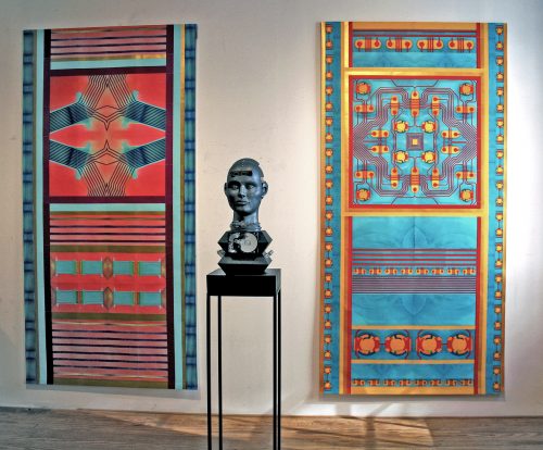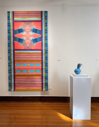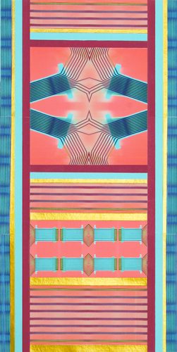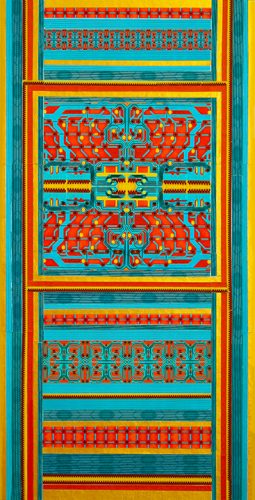 At first sight, Pat Lay’s vertical scrolls sit comfortably within the soaring Gothic-style Lemmerman Gallery at New Jersey City University. Their mosaic or tapestry-like forms, in glowing red, blue, and gold, echo the tall grided window panes and the elaborate ceiling. Yet once it becomes clear that these scrolls are entirely digital, the contrast generates a sense of fertile dualities.