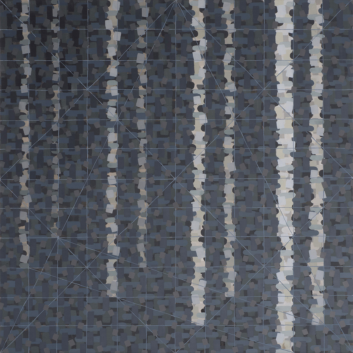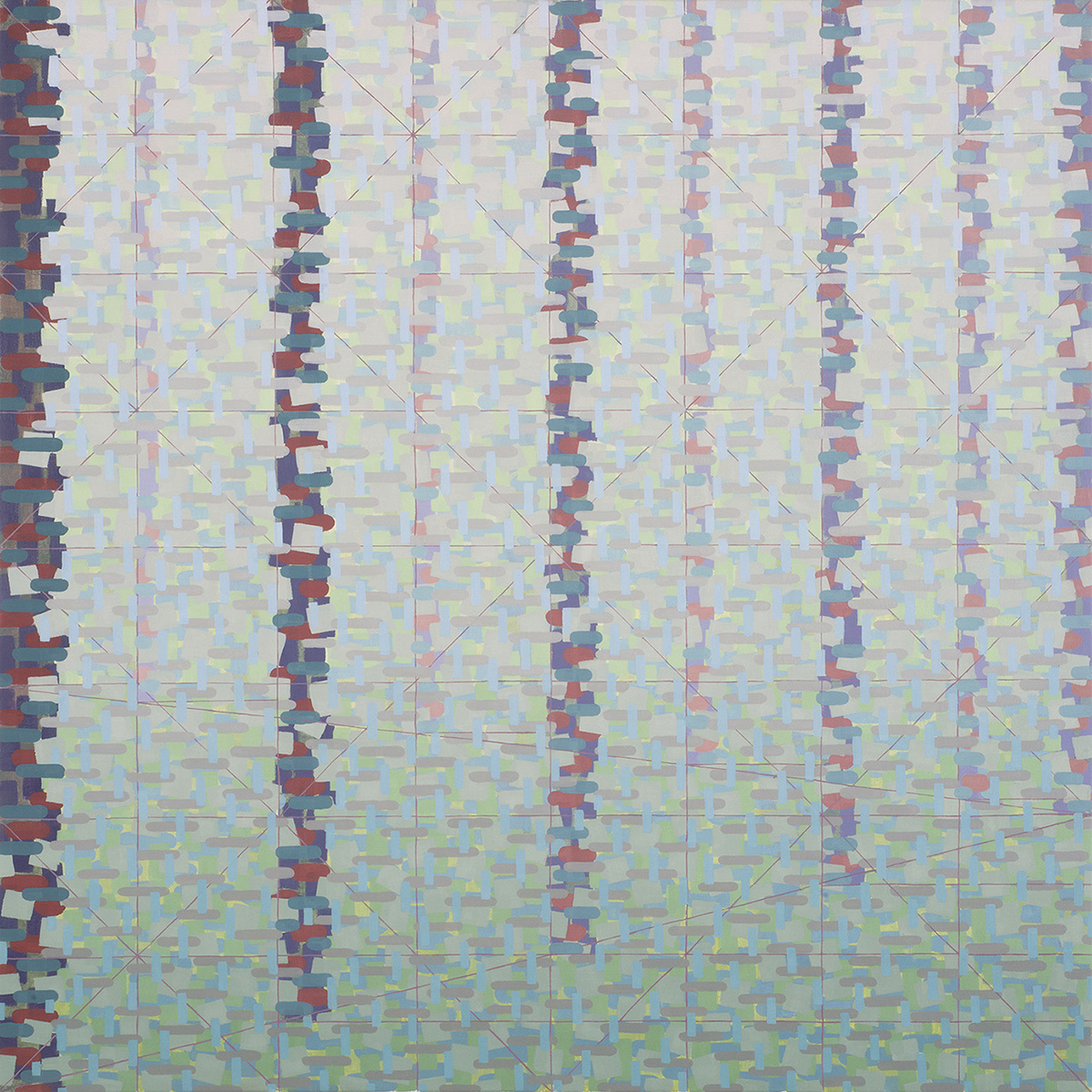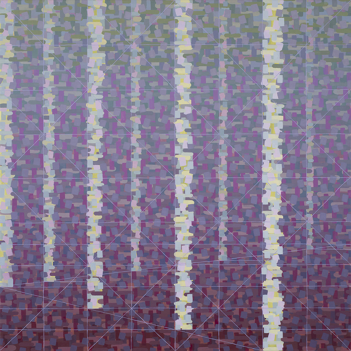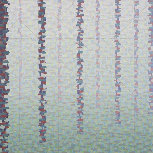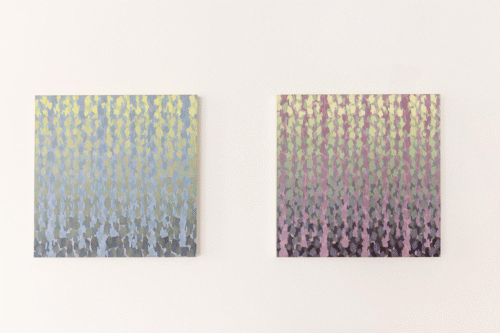 Walking into this show on a cold, blustery night, you are greeted by large windows illuminated out by gallery light. Inside, you are met with a collection of color, light, and energy. Each piece in the exhibition Spectral Evidence uses mainly acrylic to illuminate new spaces by dissolving edges, blending colors, and allowing gradients to calmly and smoothly envelope the space within the works. While each artist in the show has their own take on creating their own spaces, they use many conventions of painting and abstraction to create new forms and environments to experience, and each piece seems to flow well into the next. The gallery layout lends itself to a meandering space.