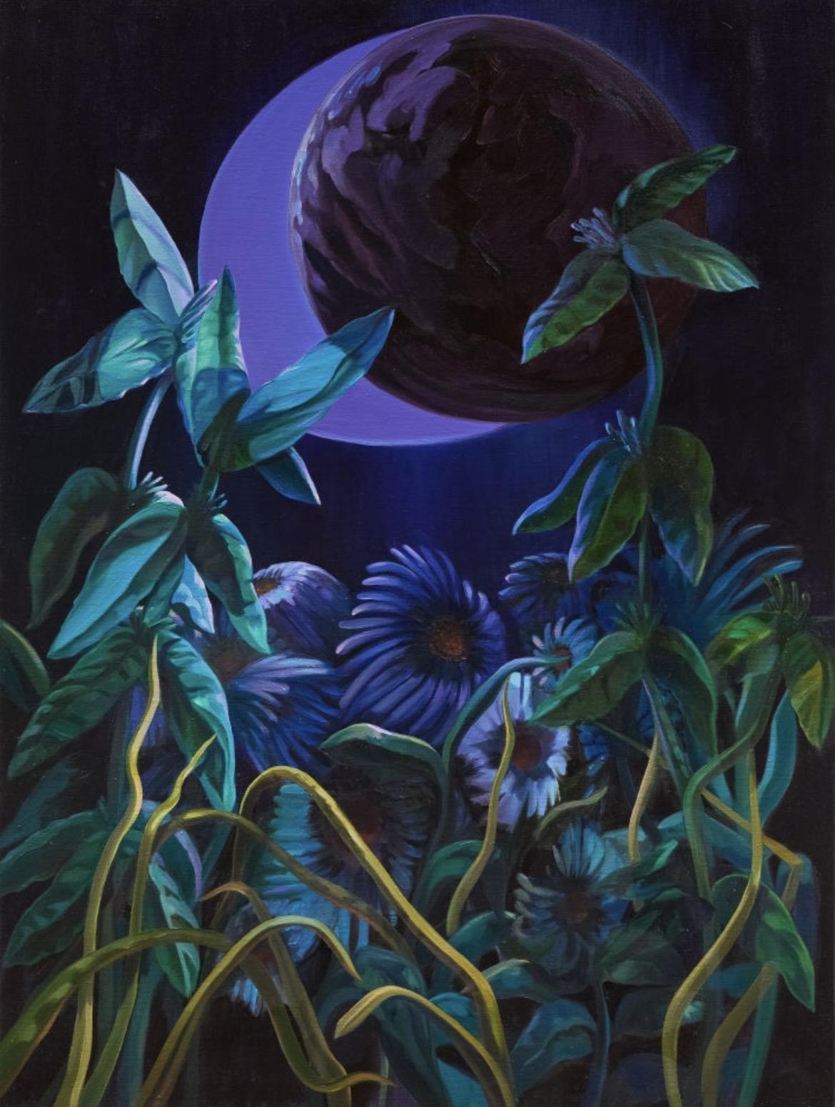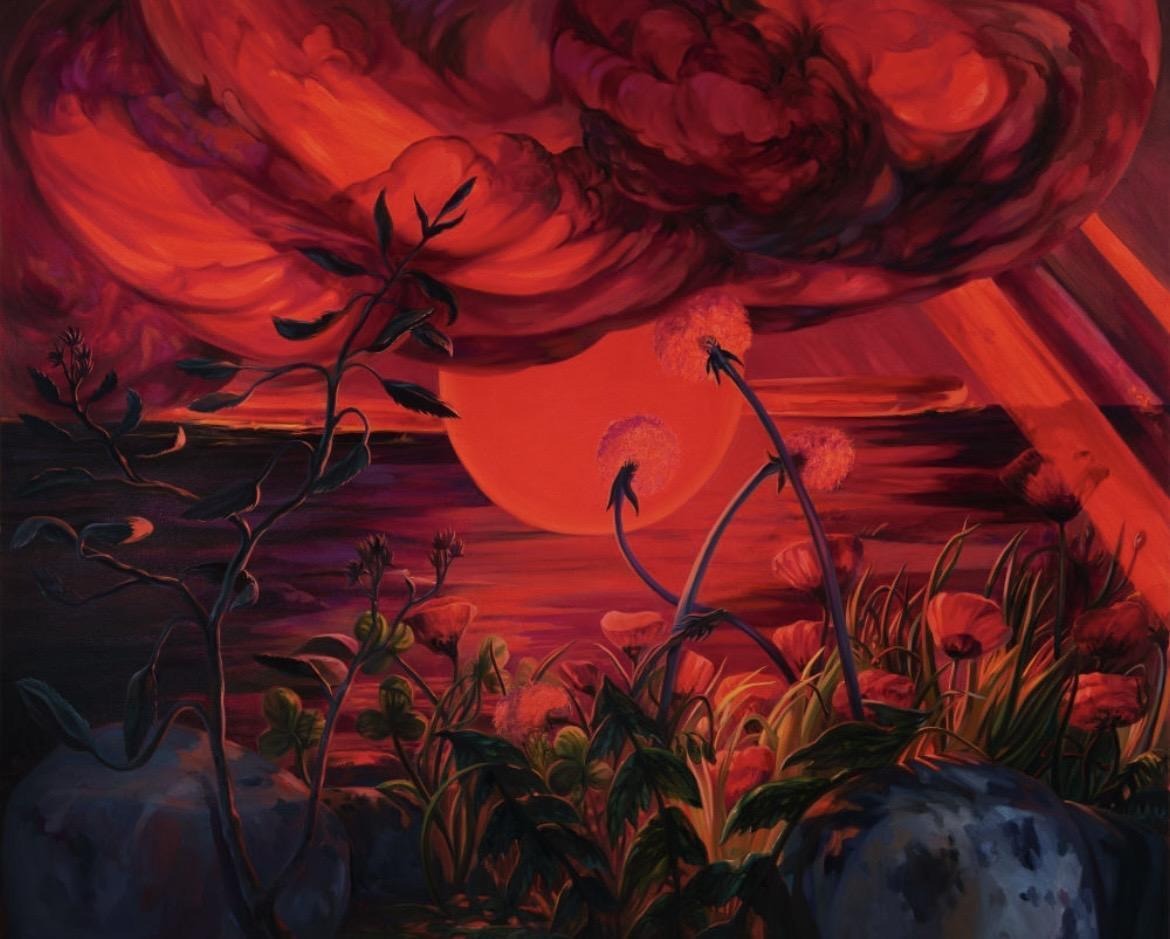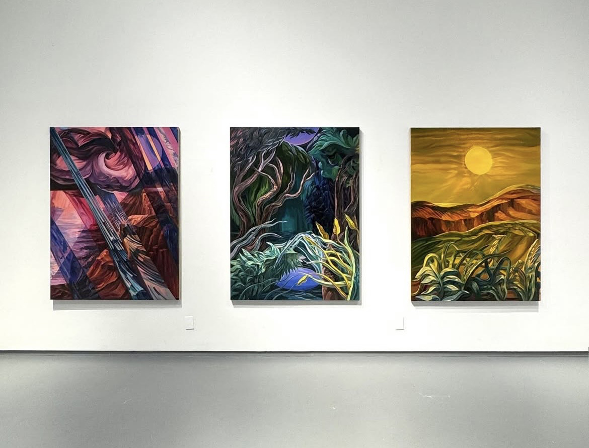 Stepping into Rachel MacFarlane’s exhibition, Afterlight, you enter an atmosphere of radiant, sweltering landscapes and venture towards an unknown future. The unpredictable future of a natural world that is vibrant, strong, and resilient, continuing to grow despite the climate changes and ecological effects that have threatened it. MacFarlane expertly situates the viewer amid a vibrantly colored atmosphere, positioning them as an active participant in the environments the paintings create.