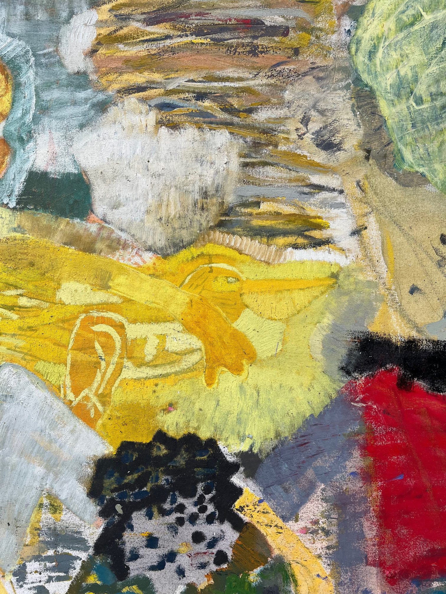Neither the exhibition text nor the online imagery, although both generous, adequately primed me for Rafael Delacruz’s spellbinding painting exhibition at Mitchell-Innes & Nash. The moment I stepped into the gallery, I was engulfed in a world with vibrant enigmatic narratives, layered as a fusion of drawing, lino-cut-like marks, and a kaleidoscope of restless patterns, all shimmering under the play of vivid paint. The paintings reveal recognizable elements like cars or figures while hiding drawings underneath, daring us to embark on a delightful game of artistic hide and seek.
