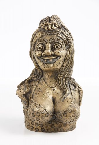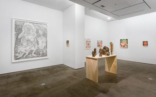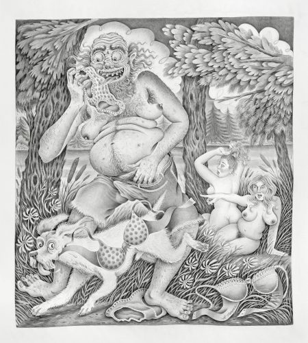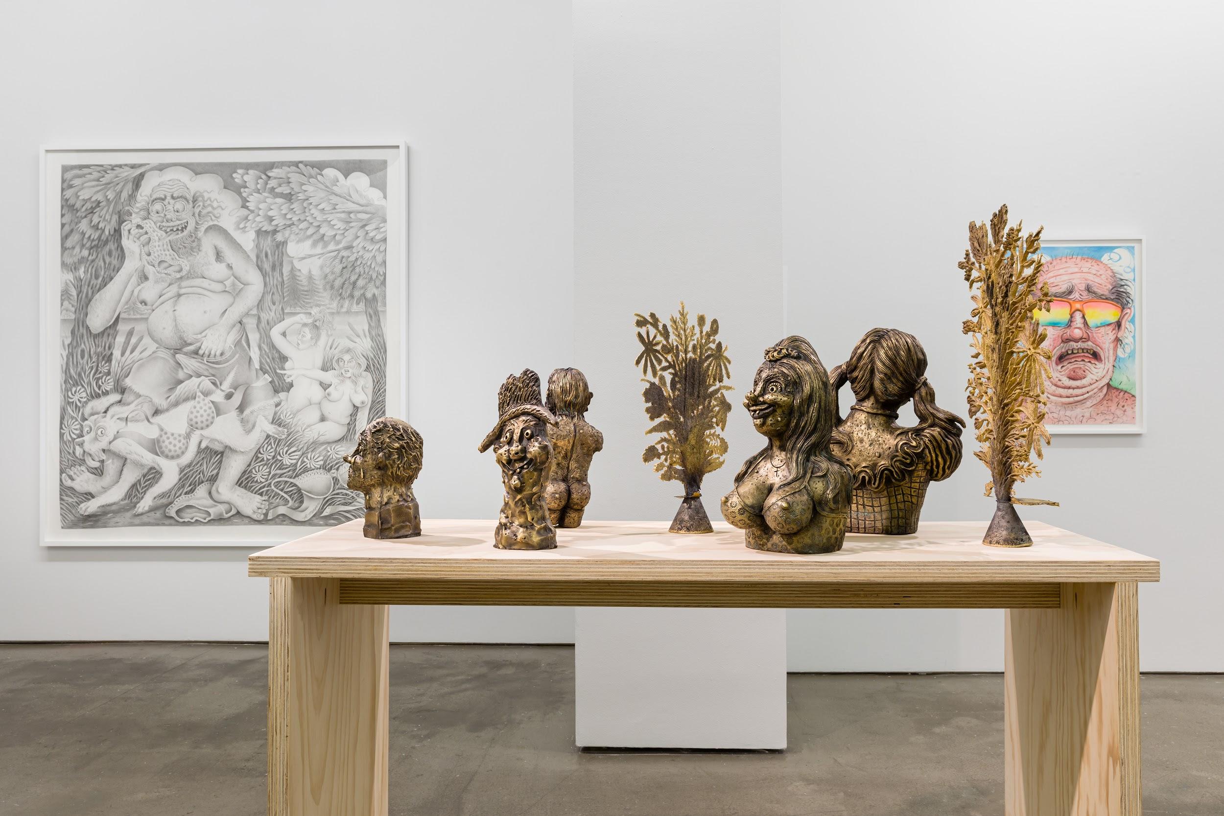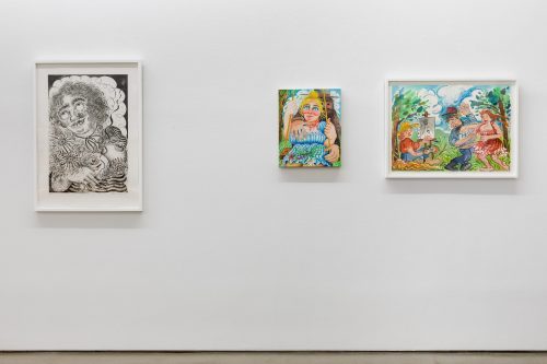 Rebecca Morgan’s solo exhibition “Town and Country“ at Asya Geisberg offers viewers a subversive and unflinching look into aesthetics of Americana. Panty raiding hillbillies, buxom bonnet sporting milkmaids, and characters engaged in Appalachian revelry scrupulously rendered in paint, graphite, and brass galavant throughout the exhibition. Morgan’s cringeworthy figuration walks the line between portraiture and allegory and highlights the pitfalls of romanticization. Inspired by the sucker-punch illustrations of R Crumb, Morgan’s depictions of rural life speak to notions of voyeurism, power dynamics, and the ubiquity of toxic masculinity within contemporary American culture. The works included in “Town and Country” strike a balance between hilarity and horror and provide a fantastical portal into the American psyche. I had the opportunity to chat with Morgan about her fourth solo show with the gallery and reflect upon her personal fascination with the subjects she portrays.