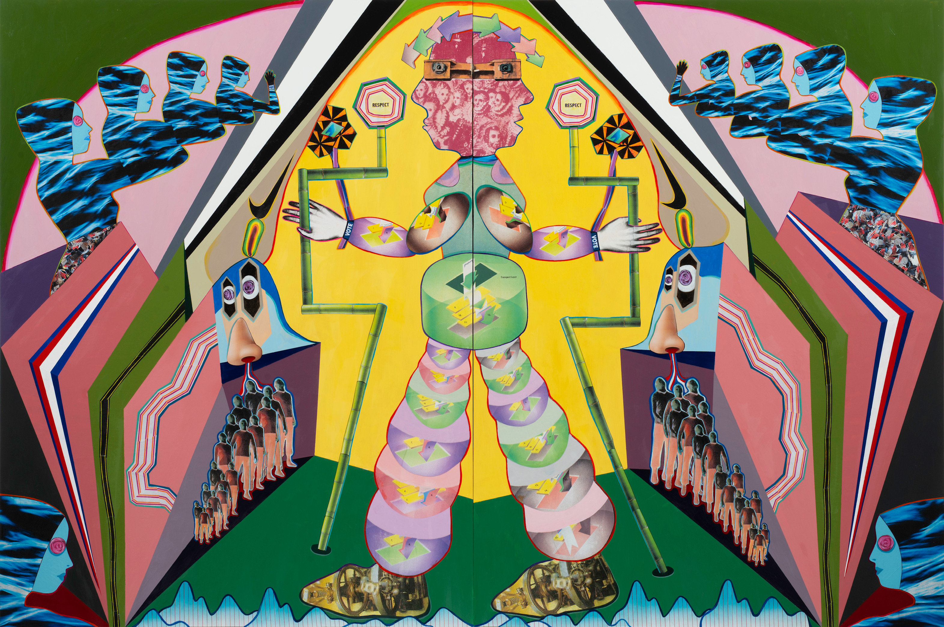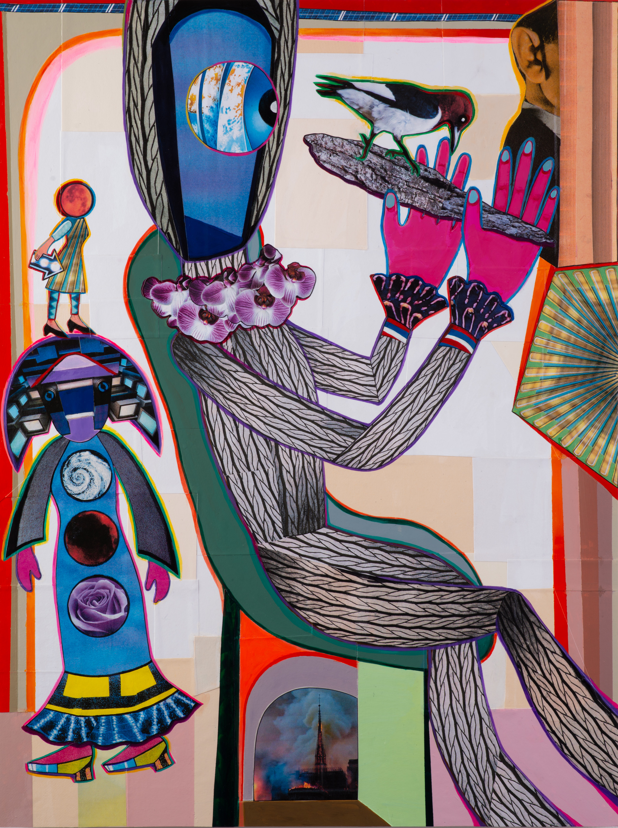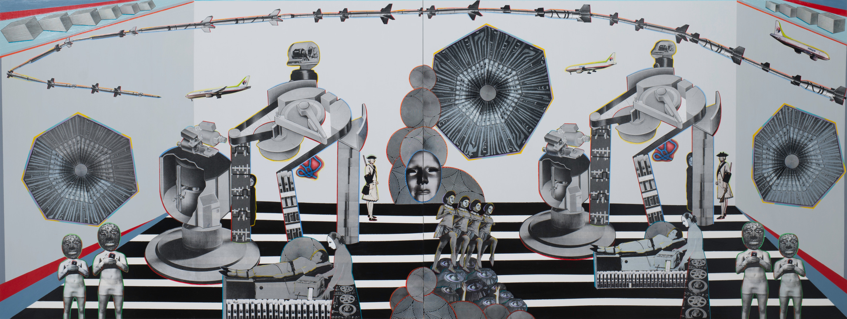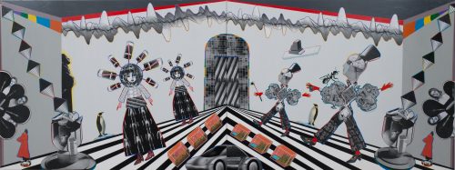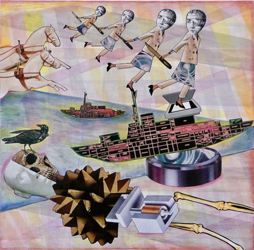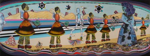 Rhonda Wall‘s collaged paintings depict surreal landscapes where the wacky and the tragic co-exist. Her topsy-turvy worlds, in which enigmatic and often over the top cartoony characters go on with their daily business, are idiosyncratic and current. Rhonda Wall shares with Art Spiel her downtown NYC art world experience during the 80s, her work process and ideas.