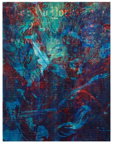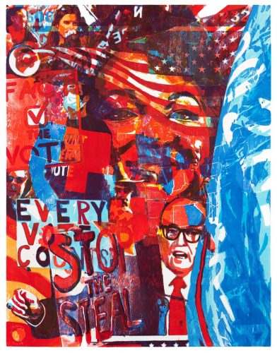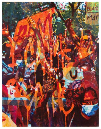 The woodblock prints by the artists Zorawar Sidhu and Rob Swainston at Petzel refer to recent harsh events that occurred in the United States and the way we perceive them through iconic media imagery. The prints specifically address 18 moments that took place between May 24th, 2020 to January 6th, 2021—marked by the COVID pandemic, the murder of George Floyd, the ensuing protests, and the insurrection at the United States Capitol in Washington, D.C. The exhibition is on view at the gallery Upper East Side location through February 12, 2022.
