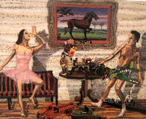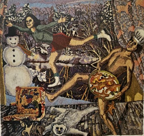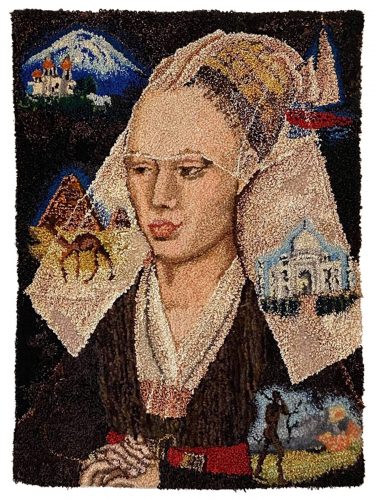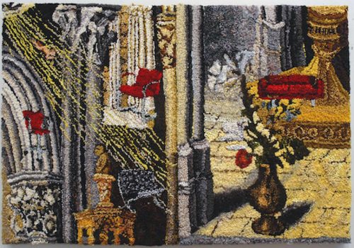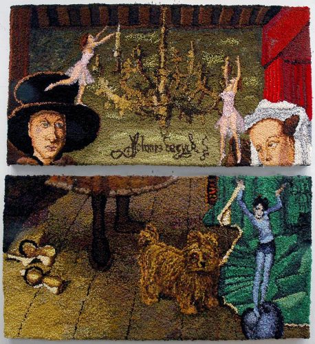 Shari Urquhart produced visual narratives from candy-like yarns that seem to glow. Each piece presents sensual fields that we can easily get lost in, absorbing each story as it slowly unfurls. The colorful works are made from fibers of wools, rayons, angoras, mohairs, metallics, fake fur, plastic and even Urquhart’s own dog’s hair. Each of her tapestries exhibits a brevity of controlled execution, awareness of composition that is meticulously constructed, making each piece monumental.