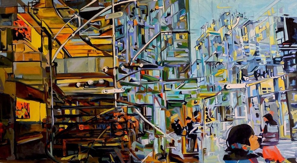 Sharilyn Neidhardt’s vivid paintings in SUPERMASSIVE BLACK HOLE, at Art During the Occupation Gallery resonate with the zeitgeist of late-stage capitalism, when human connections are strained by a barrage of information and convenience. The fractured urban landscapes she portrays bring to mind reflective surfaces and fragmentation, altogether projecting a simultaneous sense of alienation and elation that are associated with any big city life.