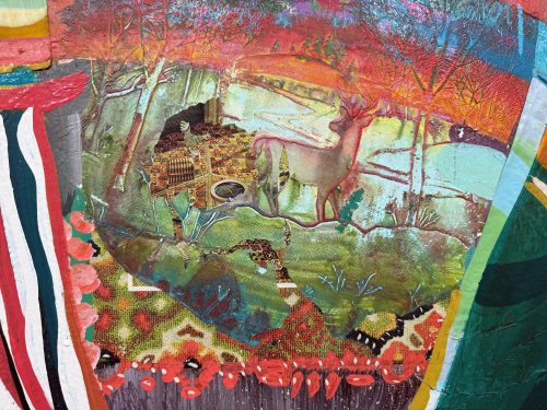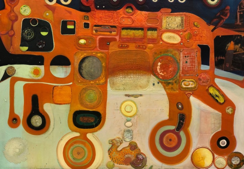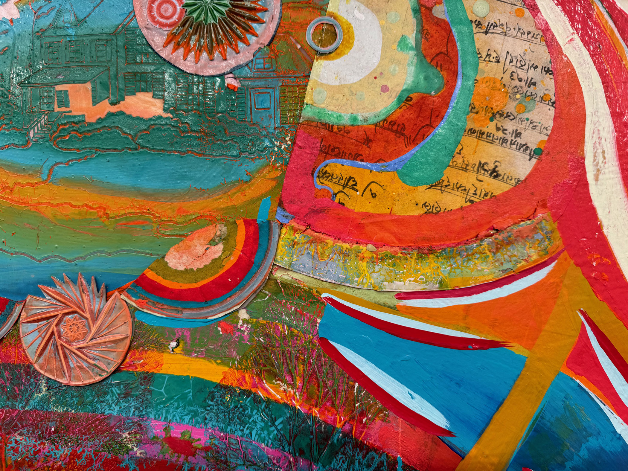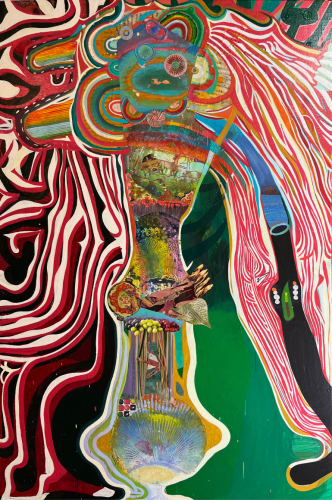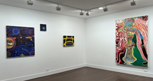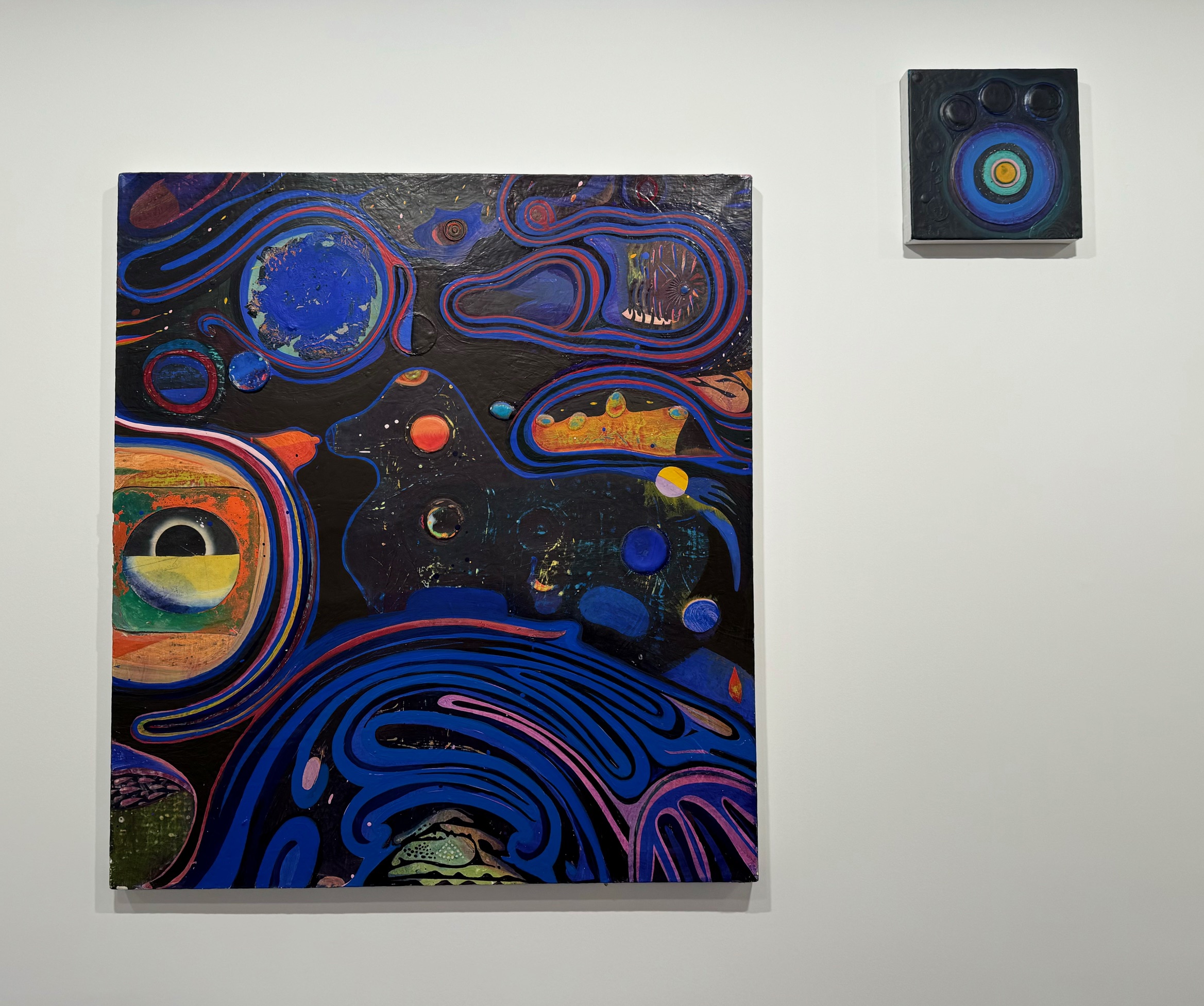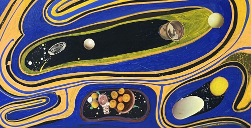 Sharon Horvath’s paintings in Small Myriad, her current exhibition at Bookstein Projects, create a sense of an alluring universe where dazzling colors, interflowing shapes, and tactile surfaces merge, meander, and as a group form an enigmatic universe unified by a mysterious code. Horvath’s spiraling lines and patterned forms create ebbing and flowing movements echoing Theodor Schwenk’s anthroposophical approach to the unifying principle of all movement and form. In his book Sensitive Chaos: The Creation of Flowing Forms in Water and Air, Schwenk posits that water movements reveal fundamental, archetypal patterns in natural and human-made environments. This deeper order finds resonance in Horvath’s paintings, but simultaneously, her imagery and use of collage also lean toward the enigmatic, paradoxical, and absurd.