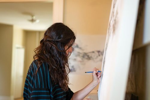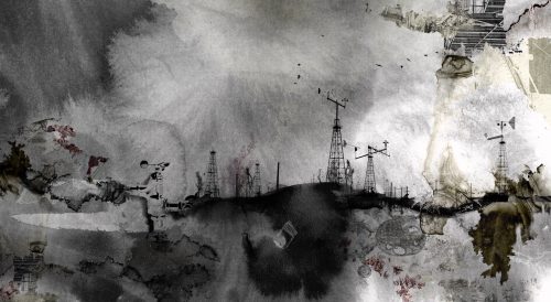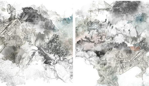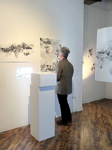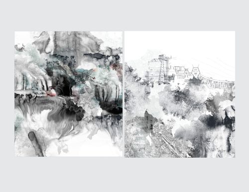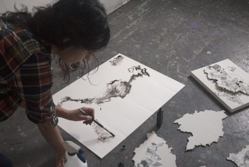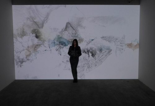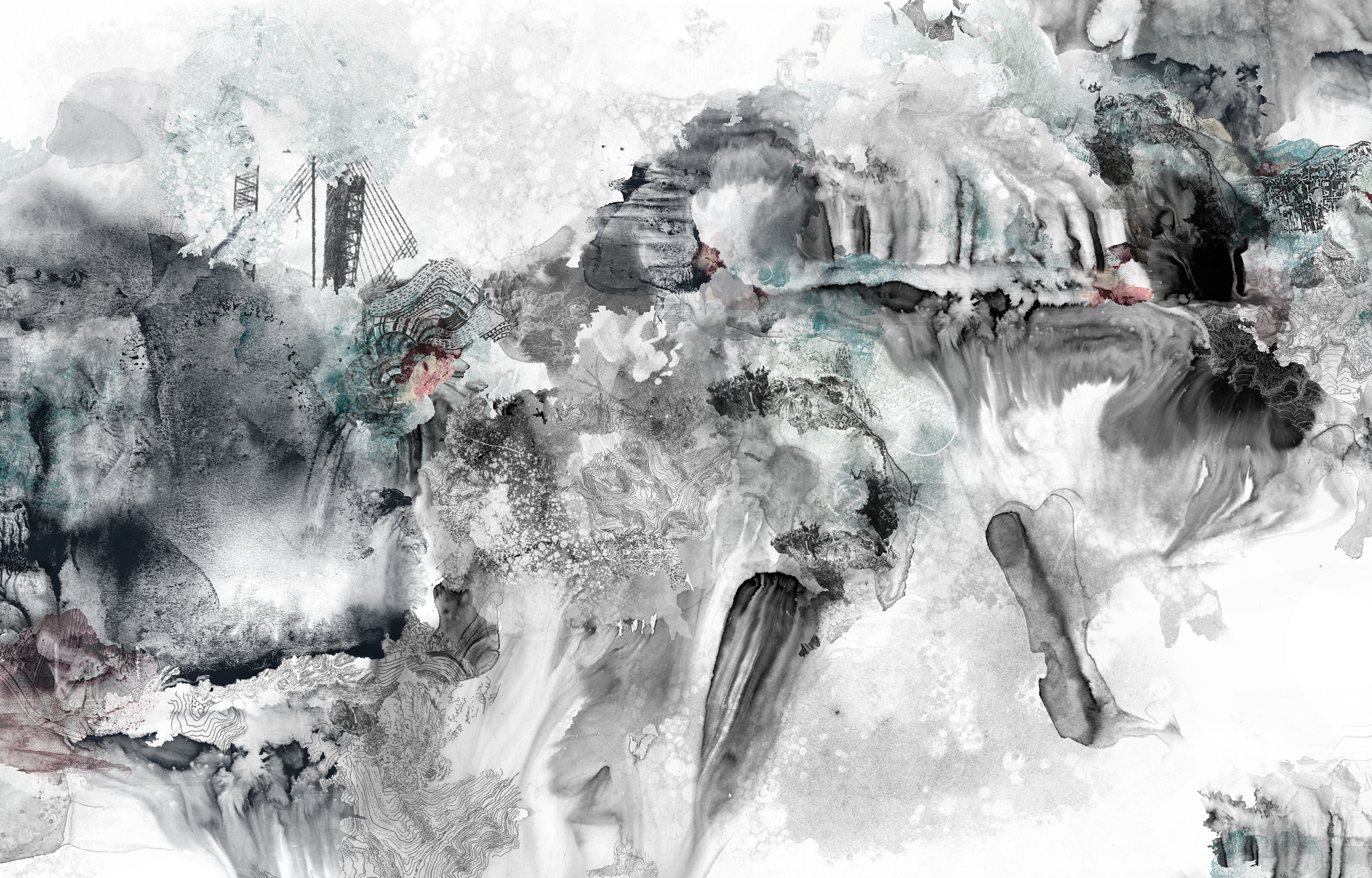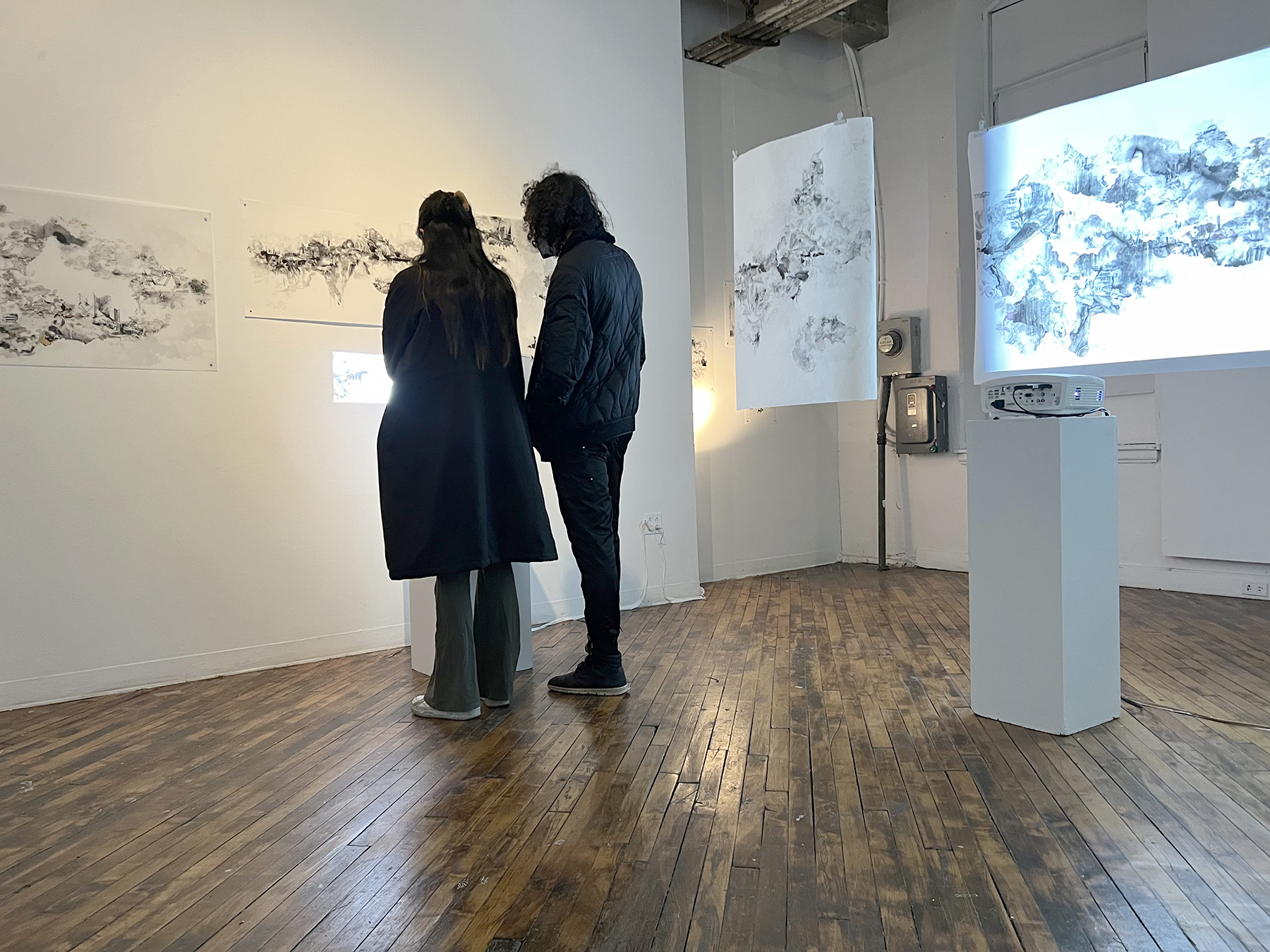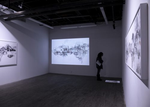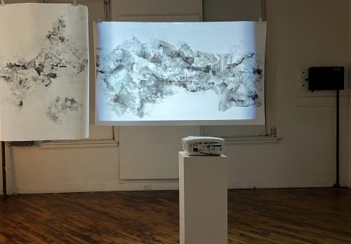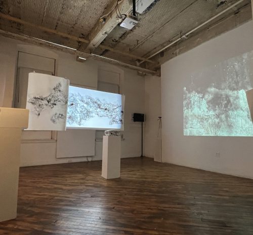 Simona Prives’s latest installation at Philadelphia’s PRACTICE Gallery, towards the noise of dark waters, combines projection and collage to explore themes of renewal and decay. This site-specific installation by the Brooklyn-based multi-disciplinary artist features life-sized projections of collages built upon densely packed drawings, ink paintings, and various printmaking techniques. These collages suggest maps, geological patterns, and industrial imagery, creating abstract yet recognizable worlds.