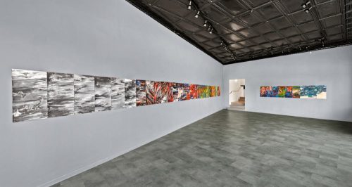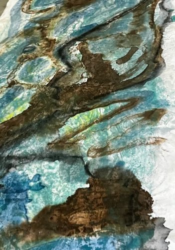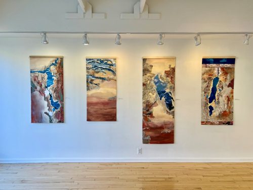 In The Tale of Lost Waters at Five Points Arts in Connecticut, Susan Hoffman Fishman exhibits seven vertical scrolls resembling satellite imagery. Four are layered in deep, earthy browns—recalling land formations and dry blood—pressing against vibrant blues reminiscent of water. The bodies of water seem suspended between presence and disappearance, drifting toward an undefined space—a light or a void.