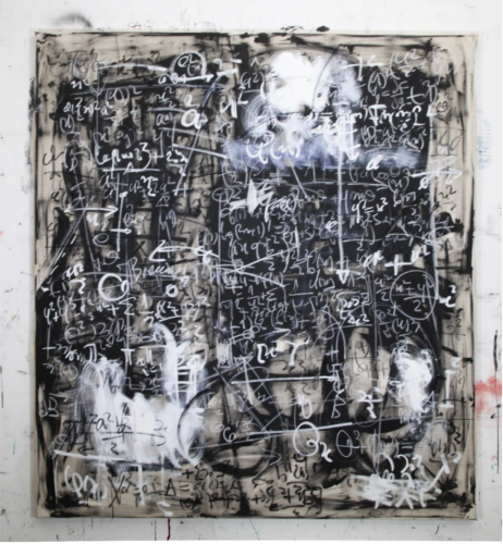 One might find Taher Jaoui introverted the moment meeting him. It might be less about an aloof temperament commonly found in an artist than a reserved and prudent character often associated with a science person. The way in which Jaoui’s artworks act out follows a similar interpersonal pattern. Those scratchy mathematics signs and formulas are the most prominent elements of the new series of monochrome paintings featured in Taher’s current solo exhibition Controlled Entropy at 81 Leonard Gallery, co-hosted by Uncommon Beauty Gallery. The juxtaposition of the handwritings of mathematical formulas and the gestural brushwork in an abstract expressionist manner not only prompts questions about Jaoui’s background, but also problematizes the hostile split between art and mathematics. Reminding viewers of a lecturer running a mathematical calculation across the blackboard with chalk, this series of paintings highlights the performative elements in mathematics, as well as the craft aspects of labor invested in this intellectual activity.