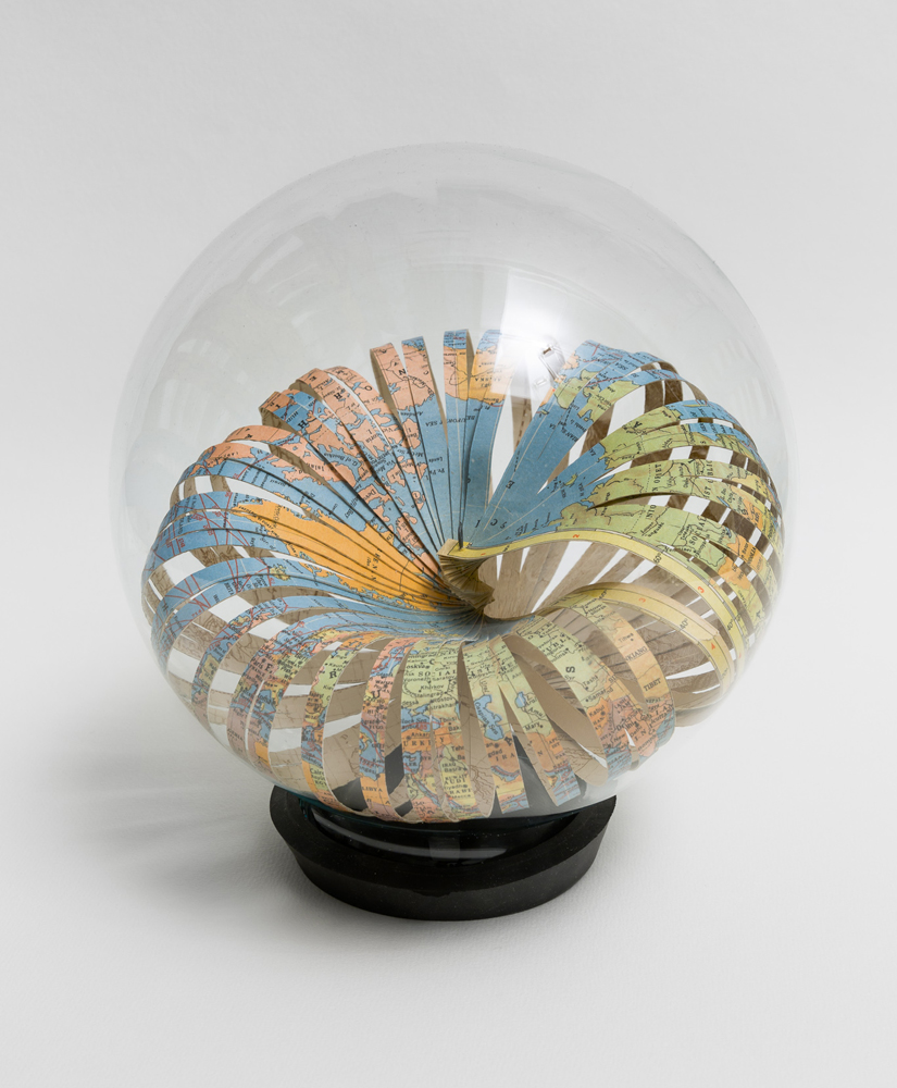 [caption id="attachment_1425" align="aligncenter" width="413"] Viviane Rombaldi Seppey, “Fragile”, hand cut atlas page (The World), wire, glass dome, plastic base, diameter 6 inches, 2017. Photo credit Etienne Frossard[/caption]