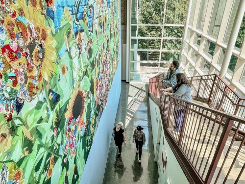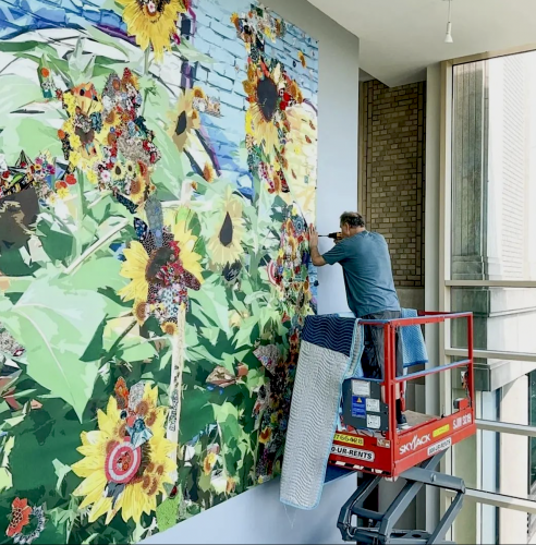 BravinLee Projects has just launched an audacious, big, and bold exhibition of 60 contemporary artists working in textile or textile-related mediums. It’s a massive show in an unlikely pop-up space. A five-story historic brick warehouse building in the Seaport that is anything but the cool, clean white box gallery that we are used to. The walk-up gallery space has vintage wide planked flooring, old fireplaces, and deeply aged brick walls. Though it must have been a challenge to curate in the space and even more of a challenge to install, the result is a fascinating presentation of artists working in a wide range of materials and styles.