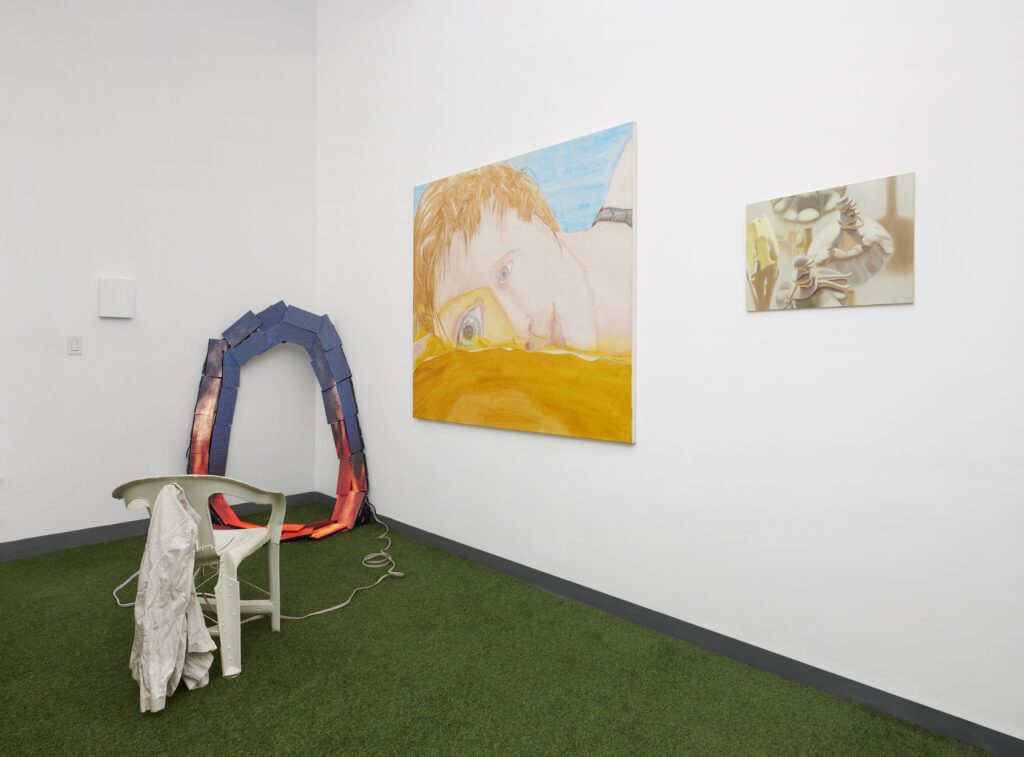 Inversely, a collaborative installation, Fire Ring and Geech Chair, occupies the adjacent space. Luke Murphy’s elliptically arranged LED screens rest between the walls and the faux-grass floor, like a wormhole beaming out of the corner. The devices display a randomly generated animation of flames.  Humbly facing the high-tech blaze stands a lawn chair found and repaired by Michael Ballou. The endearingly ramshackle chair feels inviting and friendly, while the electronic ring of fire exudes a sinister, mesmerizing power, as if something may emerge from within the wheel.  On the astroturf floor, the electronic chord encircles the seat, like a summoning circle. The wire and the chair share the same shade of beige gray, as does the coat hanging off the chair. That item–a last-minute addition–belongs to Murphy’s wife, adding an extra layer of coincidence and collaboration.