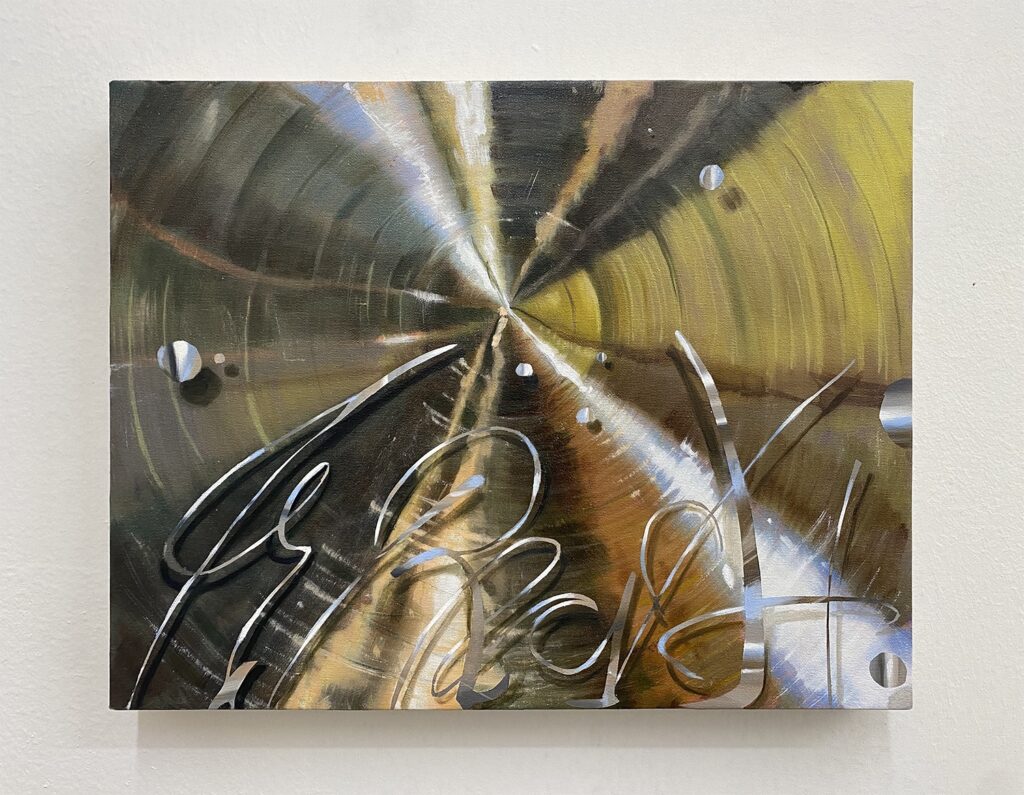 On the wall to the right, perfectly in line with that black hole of the heart, whirls the silvery disk of Bleap, an 11 x 14-inch painting by Lauren Anaïs Hussey. This work looks like a translucent record: the concentric grooves seem to obscure the light beams and earth tones of a sunlit morning.  More certain are the small details that move towards the viewer. Water droplets propel forward, capturing near-light and casting shadows onto the mysterious disk. A line of script hovers glimmeringly at the bottom edge. Except when studied, this fluid gesture merely suggests letters more than spelling a word. Does it say “I’m Ready?” or am I falling for the painting’s trick? The title, Bleap—a censor, a placeholder, a word for a sound that implies a word of its own, confirms only the work’s paradox.