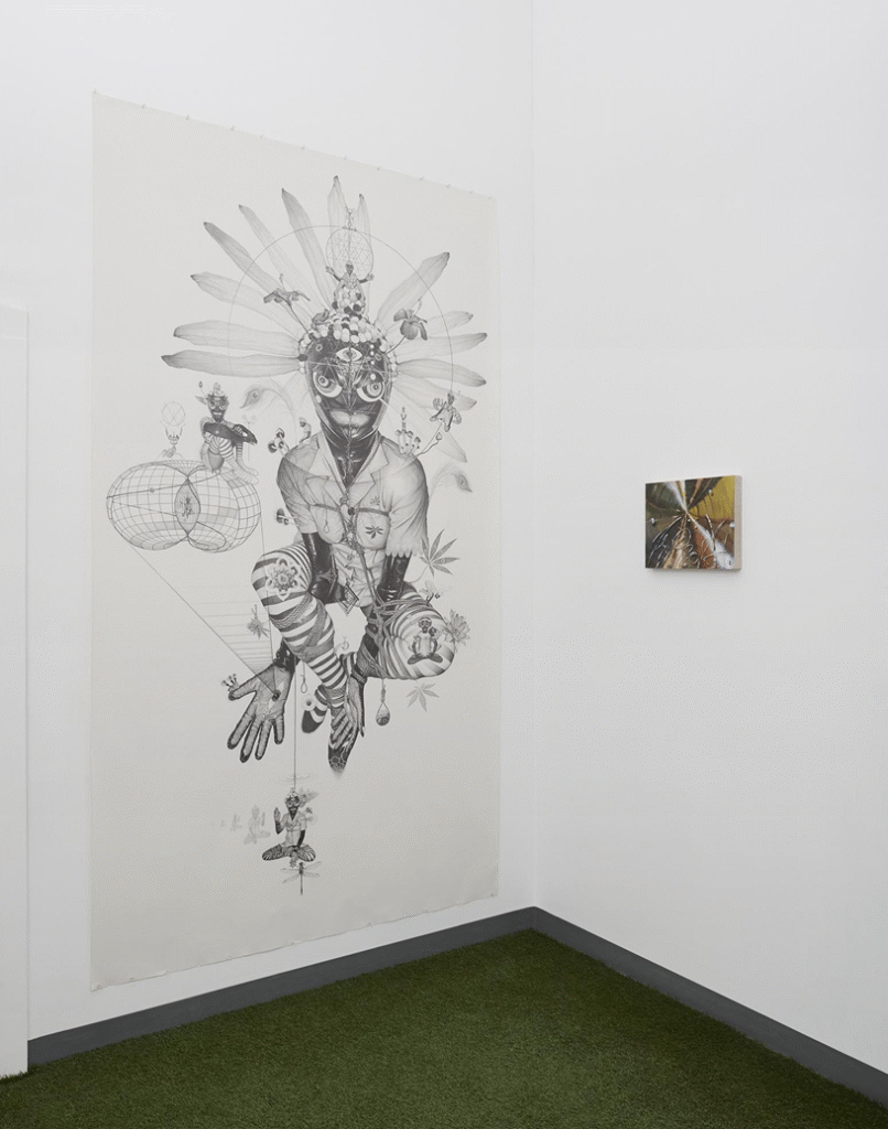 Glimpsing the show from the hallway, we are greeted by the massive graphite figure pinned to the far wall. At first glance, the pristine white paper blends into the wall, making Gavin Wilson’s leather-masked subject appear to have teleported into the gallery; the plant life and schematic imagery around this humanoid shimmer like vapor trails wavering off this new arrival. Towering at over eight feet tall, our eyes come level to the cosmic being’s chest–a black hole where ropes emerge. These ropes bind the figure and descend into a noose.  True to its title, Unnamed, Stable and True Penetrates Being with Sight in Hand, balances life with death;  spiritual freedom with physical subjugation.