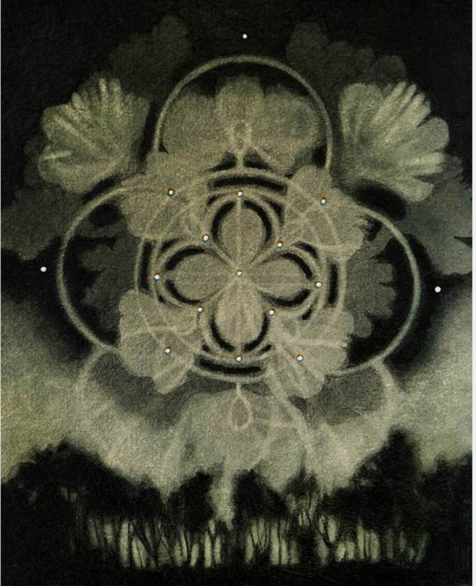 Atop these ethereal layers, Keck applies a few dots of acrylic paint. In colored pencil, small haloes of the light spectrum glow from behind the dots. Materially and figuratively, they hover above the billowing wilderness. In their precise geometric arrangements, these opaque pin pricks read as an alien presence to the shadowy flora.