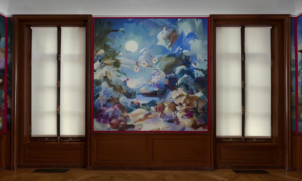 In Yukhnovich’s world, the lovers and pastoral figures of Boucher’s scenes have dispersed. Yet, their sensuality remains, diffused through gesture and color. What was once embodied in skin and fabric becomes abstracted into tone, rhythm, and breath. The room seems to breathe with its own weather — painted air swirling and luminous, full of pleasure, restlessness, and yearning. The mural captures each season through its pulse: spring opening into radiance, summer thickening into heat, autumn glowing in fruit and dusk, winter moving upwards toward stillness.