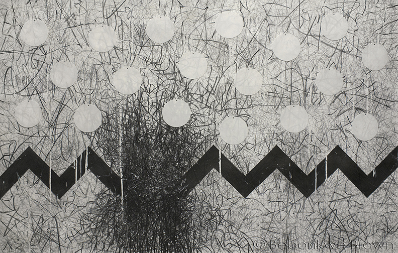 Technicalities aside, once the artworks were selected, the idea to organize them in terms of habitat and interconnectedness seemed obvious. Even more wonderful was the way everything came together during installation, enabling the exhibition itself to exemplify interconnected habitat. Simulating a grove, one wall features paintings replete with trees, branches, flowers, fungi, roots, animals, and seeds, including pendulous cigar tree seeds (Catalpa speciosa). Two-sided drawings dangling from wires that span three columns fortuitously mimic marks and gestures visible in nearby artworks. As a result, notions of entanglement and sinuousness abound. Continuing the tradition of Plains Indian women’s drawing abstract geometric motifs, Indigenous artist Bebonkwe’s post-traumatic entanglement (Opal) proffers a sober counterpoint to this exhibition’s surfeit of exuberant renderings like Pamela Casper’s Forest Spectacle and Deborah Wasserman’s Migrating Crop.