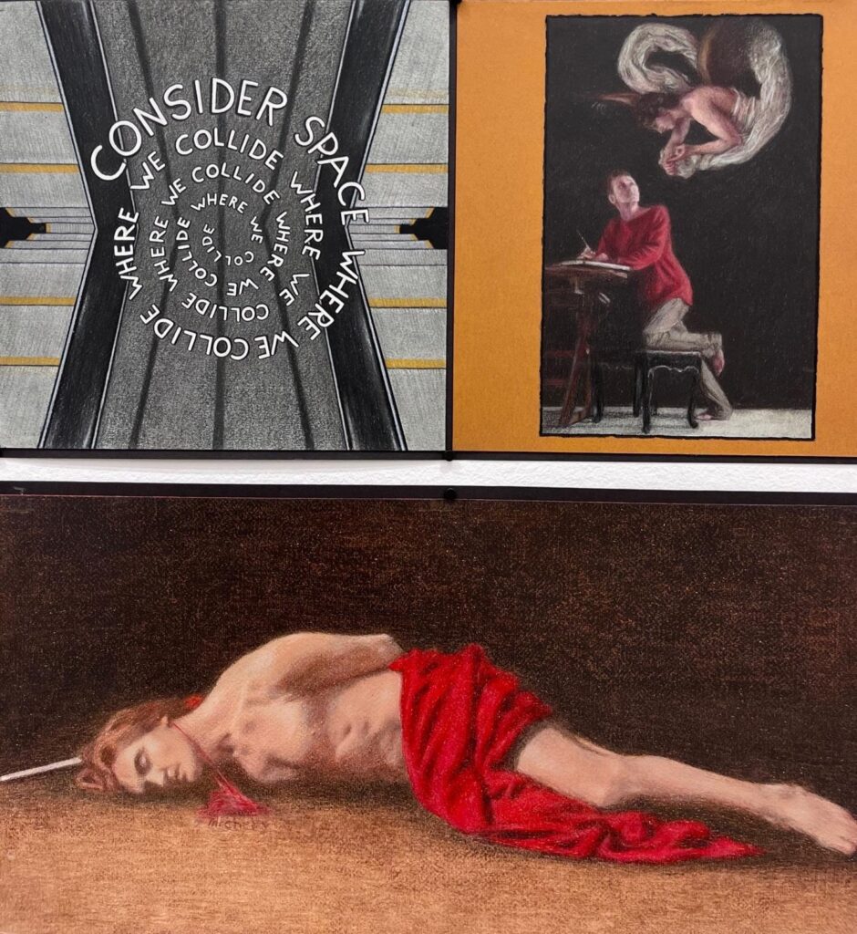 Kelly begins his sequence by adopting figures from Caravaggio’s paintings, which he sees in a book. He develops a set of portraits based on Caravaggio, a reenactment of contemplations on his graze with death. Kelly portrays a conspiracy, flamboyant night dining, a memory of beautiful, flashy young shoulders and flower-crowned youths, as if in a vulnerable dream. He imagines himself recreating the young figures as his mature self, keeping his drawing in the same color scheme of the light flash covered in blood-red fabric against the dark background. The Caravaggio-esque rendering functions as stage notes for the reenactment scenarios that become a new way to understand what led him to that fall.