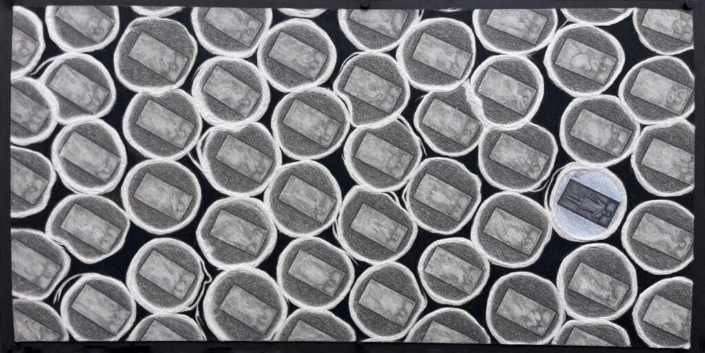 Following his accident, Kelly diverts in his portraiture in parallel new directions, as a way of dwelling on his accident from many aspects, searching for evidence. His previous performance drawings turn into horizontal poses as he is laying with a neck brace on a stretcher. He now continues with the lying figure, looking at it from a bird’s eye perspective, drawing himself in graphite, flat on a stretcher with his legs ajar and his arms straight, slightly open beside his body. He repeats this image throughout his work, trying to understand the abrupt change in his life. In a few of the drawings, he makes himself very small. In this version, he encircles his tiny figure on the rectangular stretcher, then multiplies it to create a two-dimensional cellular net all over the page, becoming biological and almost unrecognizable.