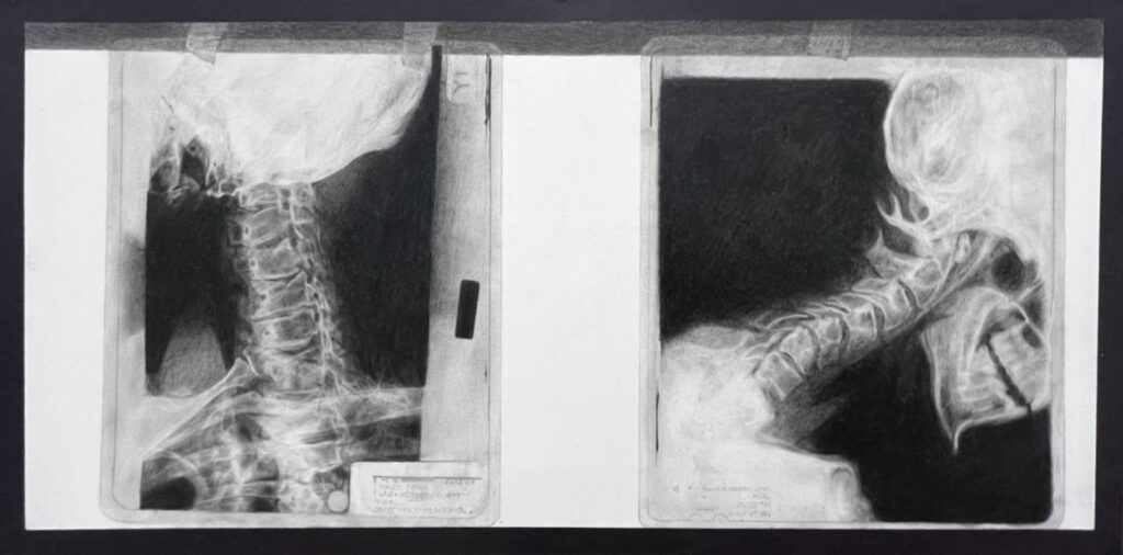 In another stream of thought, Kelly draws his body from the inside. Using his medical results, to reach and investigate into parts of himself that he cannot see, making monochromatic drawings of X-Rays of his curved spine.