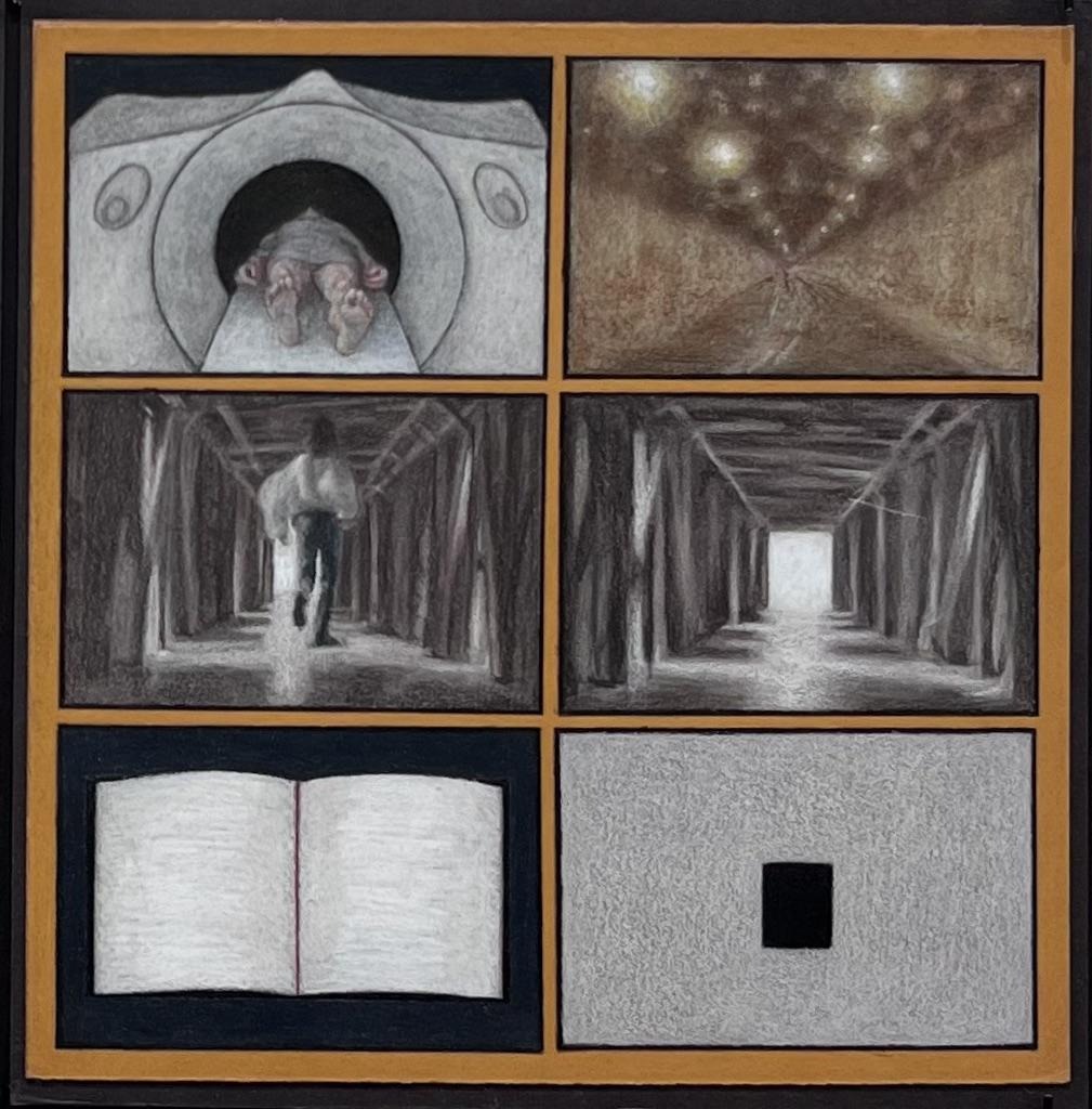 As the world of his injury takes on the rest of the narrative, Kelly makes poetry out of the medical. He adds to the X-rays also other procedures. He renders the round MRI chamber like a contemporary shrine. In his small drawing, he manages to turn that medical device into a mythological purgatory, reflecting on his sense of tunnelling to peek at mortality.