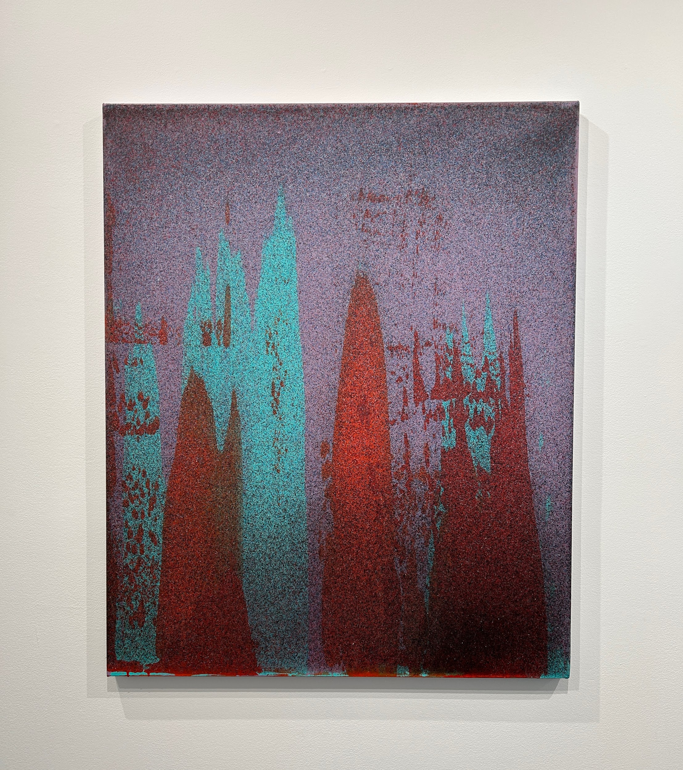Knuth mentioned many influences in his works, one of the largest being Monet. Inspired by Monet’s gardens and sunrise works, the radiation of both color and light, layered together, builds up a dense atmosphere and a new environment in which we can venture. The deep maroons of Rothko also seep into the margins and build up many of the foundation layers of these paintings. These works, while created from organic chaos, have always resembled the great expanse of urban landscapes such as New York City and Los Angeles, especially by the piece titled New Track. The shadows of buildings lurk just on the surface, far enough away from us, hidden by smoke, ash, and a haze of color, that we cannot discern any signifying details of the place. We just have to enter space and explore the new landscapes ourselves.