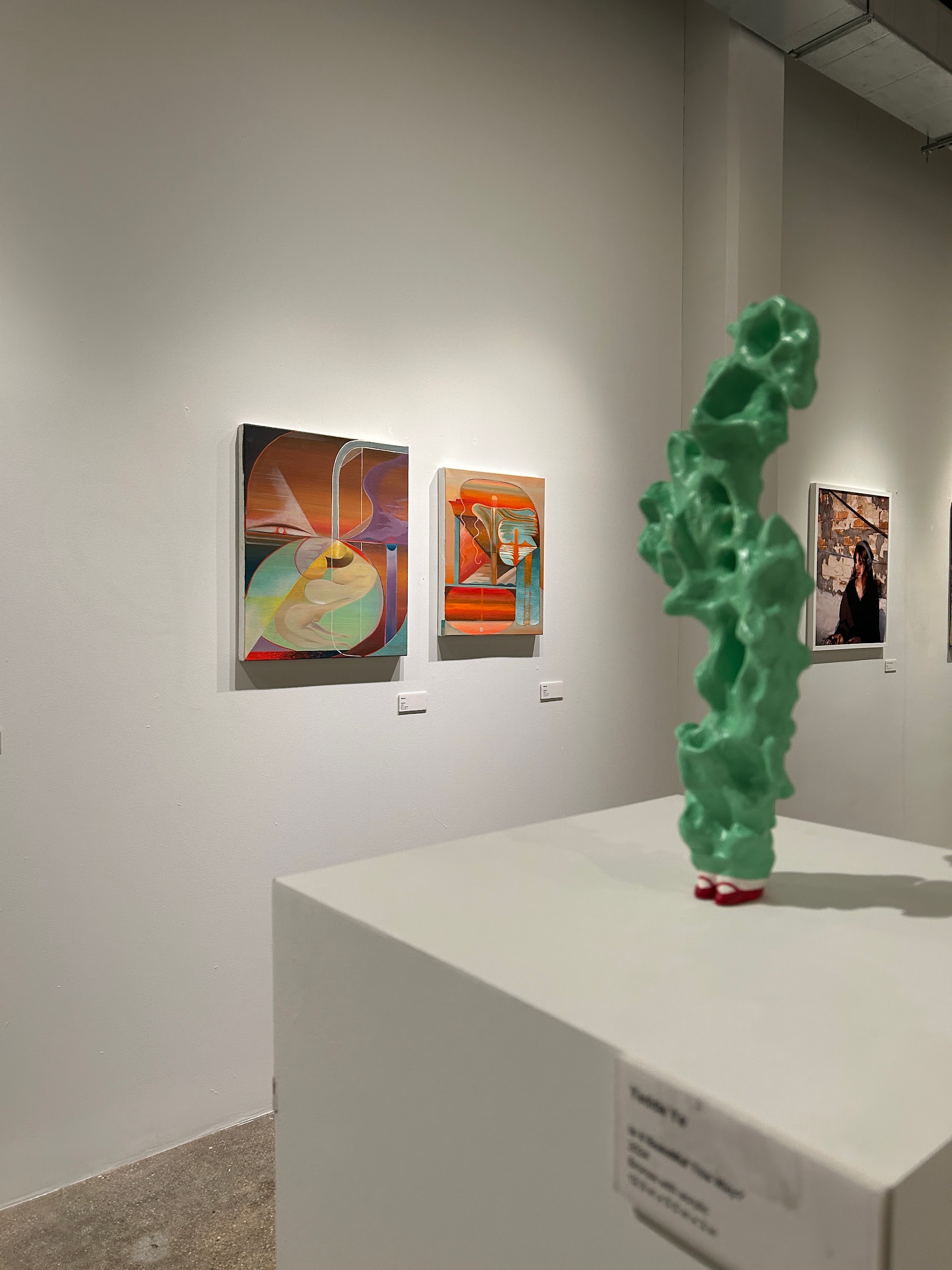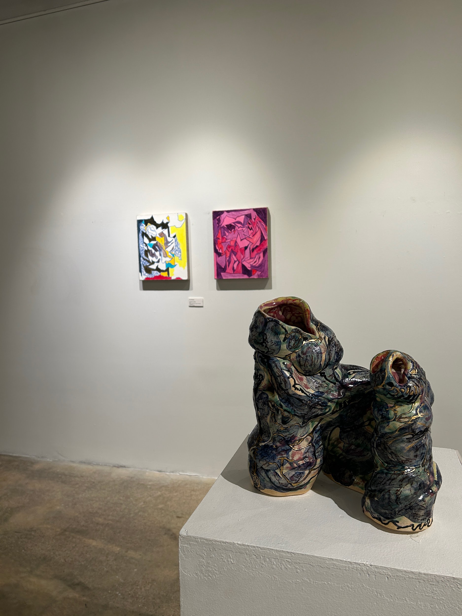 The connections in this exhibition are vast. While the artworks diverge onto their own paths, they still converge in similar aspects later on. Avery Schuster and Rodrigo Tafur both use color and layers to build up forms on the canvas to create illusions of environments. While Greta Schneider and Zakariya Abdul- Qadir take items from an environment and use the idea of images and text to express their inspirations and explorations on how transitory language can be.