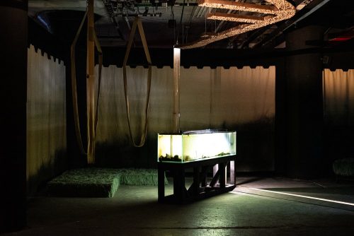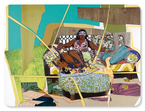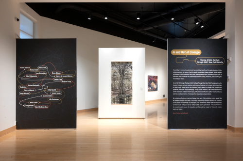 Silence Breaking is a hidden gem of a show featuring abstract paintings by Gail Winbury at the Carl and Helen Burger Gallery on Kean University’s idyllic, park-like campus in Union, NJ. A New Jersey native, Gail Winbury’s oil paintings depict interpretations of various poems and personal stories that manifest into abstractions with colliding shapes and colors. Her use of gestural abstraction and expressionist lines reflect her interest in the elicitation of psychological responses via painting. Most of the work in the gallery is in large square format, dominated by celadon or mint blue green – a color frequently ranked among the calmest colors. The Field of Green series, which is most of the show, is a departure for the artist, whose previous series had much more aggressive lines and brighter shapes, which more comfortably rested into a traditional rectangular surface dimension. The compositional choices in this body of work are deliberate and minimal, reflecting a more meditative feel full of cooler tones and calmer transitions.