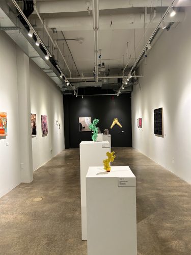 This group exhibition at the IW Gallery brings together a wide array of artists, visions, and mediums. Each of the eighteen artists in the show is connected in some way, whether it be from Pratt Institute, they are former international students who have decided to stay and continue making work, all the way to friends and former classmates. This grouping is an eclectic amalgam of stories and inspirations that diverge in their own ways and reconverge to create new conversations. Many of the artists in this exhibition use their work to embody their stories, memories, and histories. Pieces of their lineages, carrying across various places to join together in one location starting an ever expanding dialogue with each other.