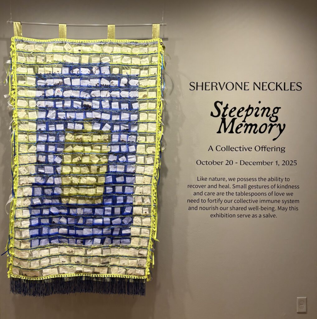 This harmony is expressed in a series of transparent quilts which hang in the gallery space and through their neat cubicular patchwork assemblage, represent the notion of a healthy community/society. The process of experiencing the Creative Wellness Gathering Station is two-part: the main objective is providing visitors with a small wellness packet of herbs, but they are then requested to make a small sachet of their individual recipe and contribute it back to the community, also including their first name, location, and perhaps a thought.