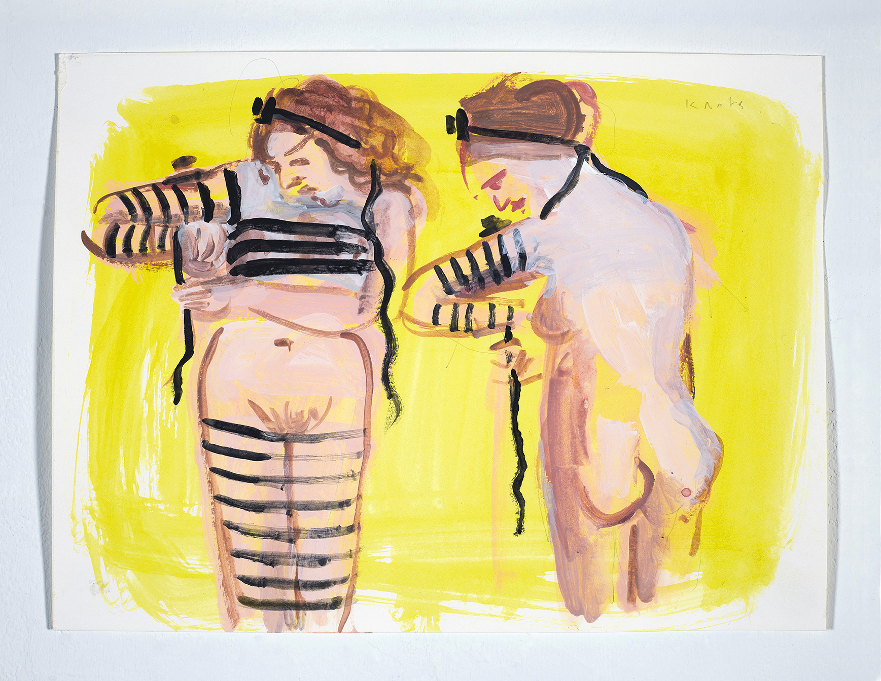 In this exhibition, several pieces mark Bassel’s departure from the canonical imagery of Renaissance paintings and old masters. Her infatuation with witches led her to seek out images of rituals and fantasy that preceded Christian iconography. Recalling the scriptures she studied as a child in an Orthodox Jewish household, Bassel realized that many of the texts she recited described miracles and rituals meant to bring these about. Some of them have a guest appearance in this exhibition: The ritual of the scapegoat at the temple, performed by the high priest, is depicted in a medium panel showing a woman tying a red string to the goat’s horn. The tale of Honi the circle drawer, a pious man who saved his community from drought by drawing a circle and standing in the center, begging God for rain, is present in Circle Maker. Here, a woman reclines on a bright red background, drawing a circle around herself. Traditionally, women do not perform these rituals in both the original texts and Orthodox practice. However, in Bassel’s paintings, they boldly claim this sacred space, performing the rituals themselves. The most striking example is in the “Binding” series of small-scale acrylic-on-paper sketches. Nude female figures are busy wrapping themselves with Tefillin, the small leather box containing Hebrew texts on vellum, worn by Jewish men at morning prayer. The sacred straps envelop them head to toe, around their breasts and between their legs.