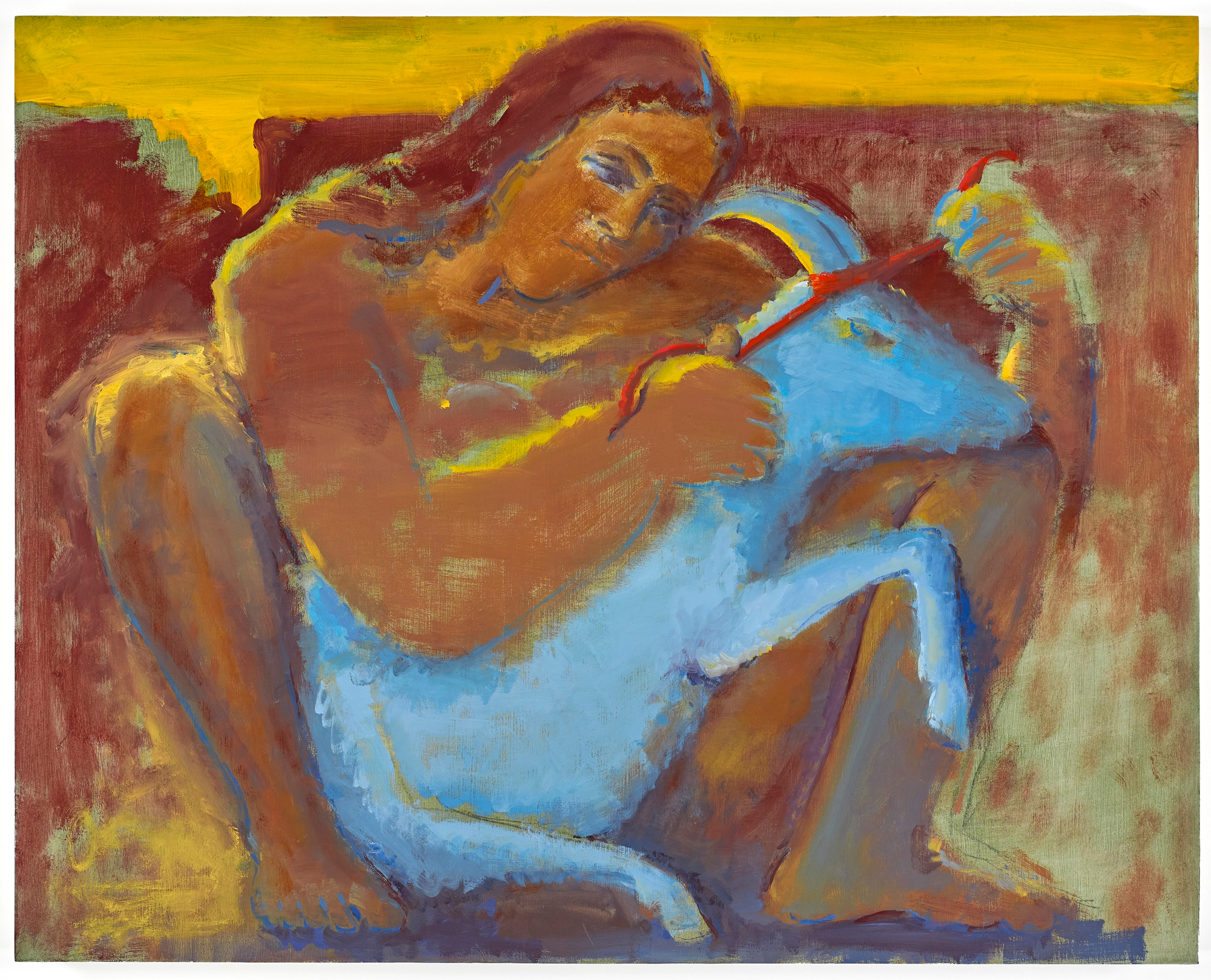 Bassel explains that The Broom (After Fragonard) was the first painting she created in this new body of work, and that when she finished it, she felt it was risky to show, as it was too easily ridiculed. “A witch on a broom? Come on,” she thought. But this moment of discomfort was a key to a breakthrough, as is often the case in an artist’s process. Rather than shying away from it, Bassel decided to explore the source of discomfort. She asked herself why images of women in liberated, unconventional roles and postures still provoke embarrassment. Such responses might be rooted in the broader structures of power within the art world and the world in general, where traditional narratives have long been dominated by male perspectives that are often internalized by women. In this series, there is not one male figure; all of the women are unapologetically naked, wild, fleshy, and moving in space with complete freedom. They come in all shapes and sizes, ages, and colors. They sit with their legs spread, unbothered by exposing their body, as they climb trees, play together, weave baskets, and suppress wild beasts.